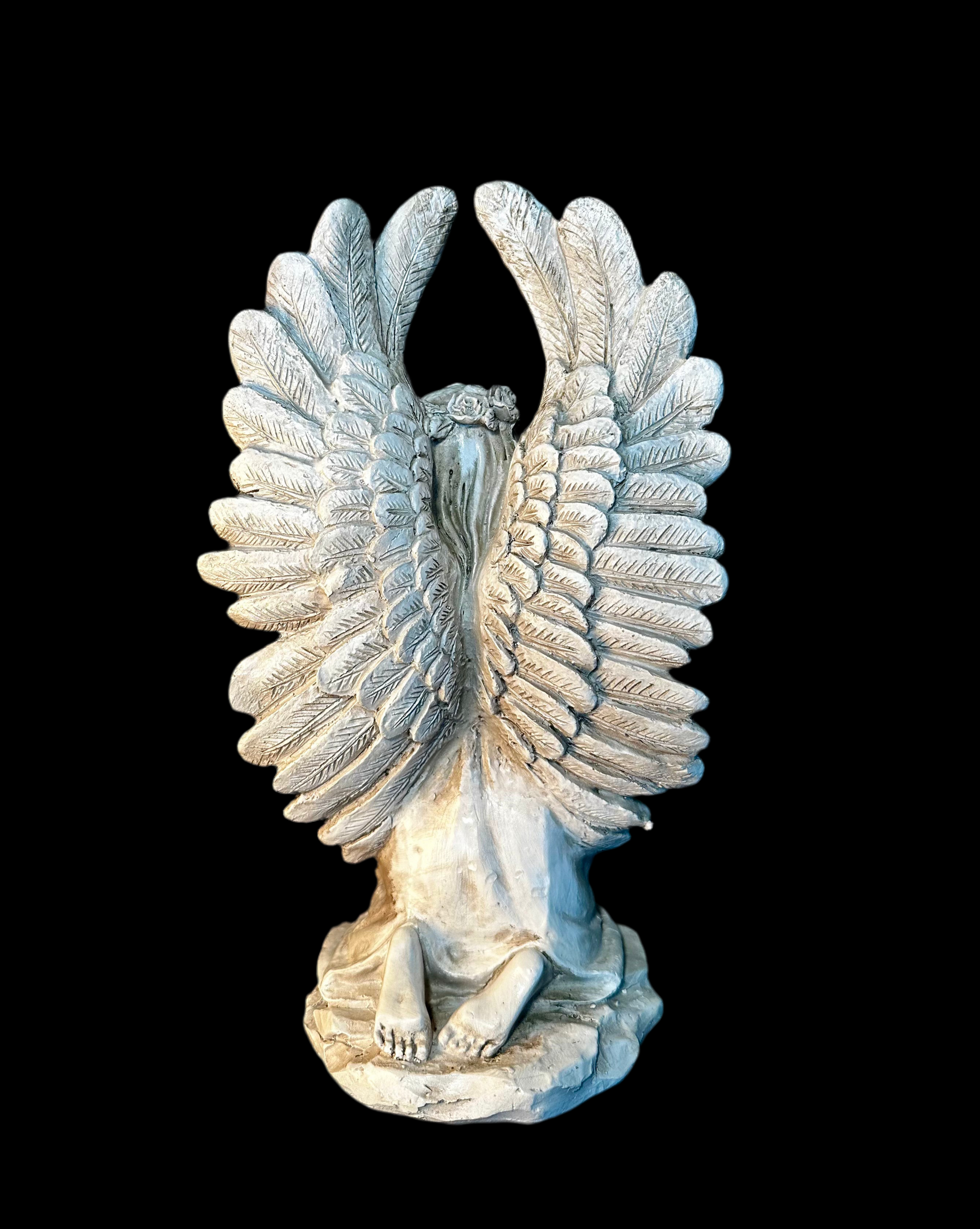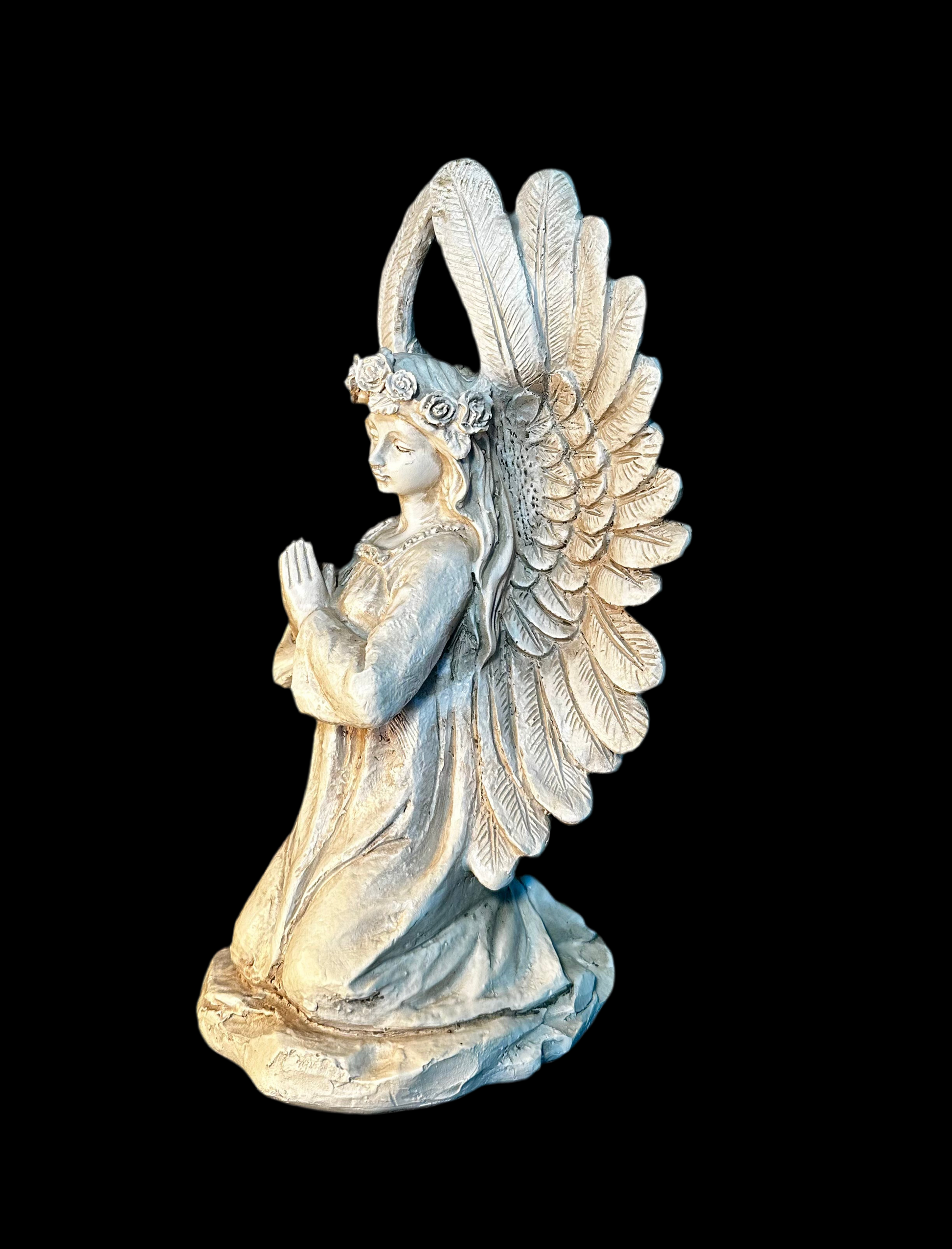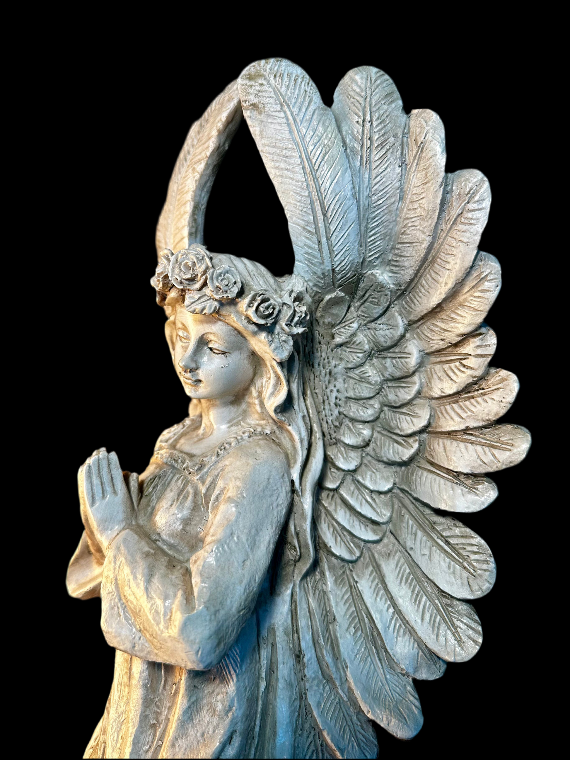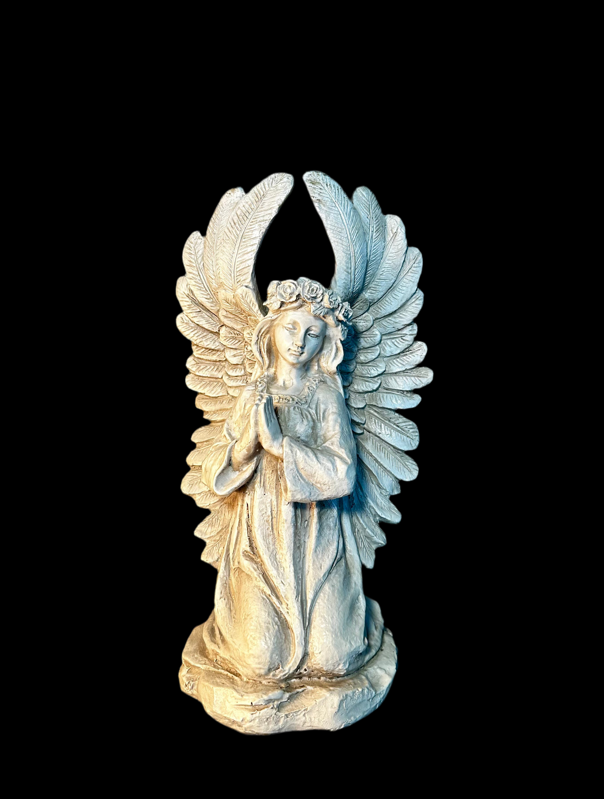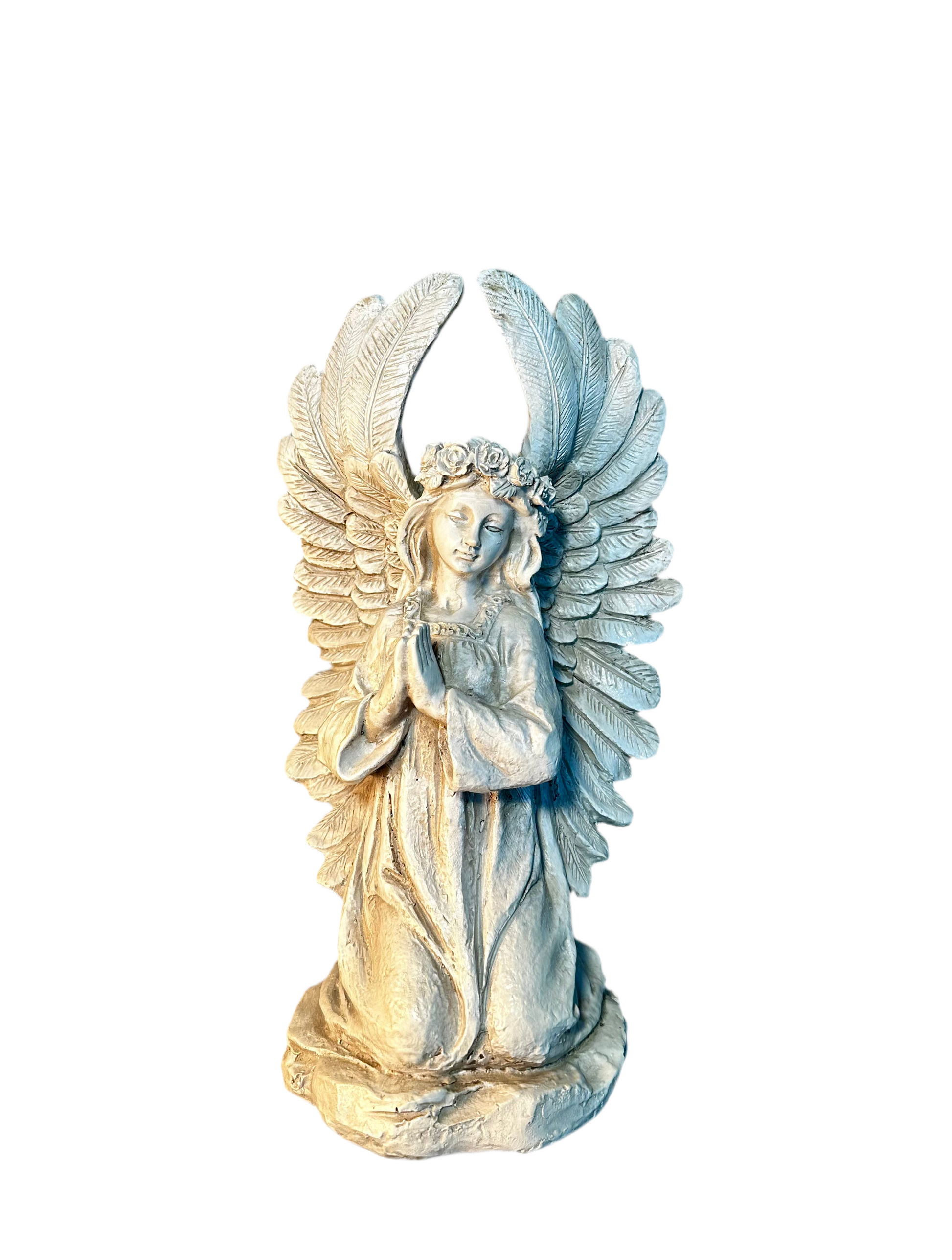 Aniołek z wiankiem w kwiatuszki wykonany z poliuretanu to idealna dekoracja na cmentarz, symbolizująca pamięć i spokój. Wysokość 32 cm i szerokość 17 cm, dzięki czemu jest stabilny i dobrze widoczny. Figurka jest odporna na warunki atmosferyczne. Anioł tworzy nastrojową atmosferę, dodając blasku każdemu miejscu pamięci.