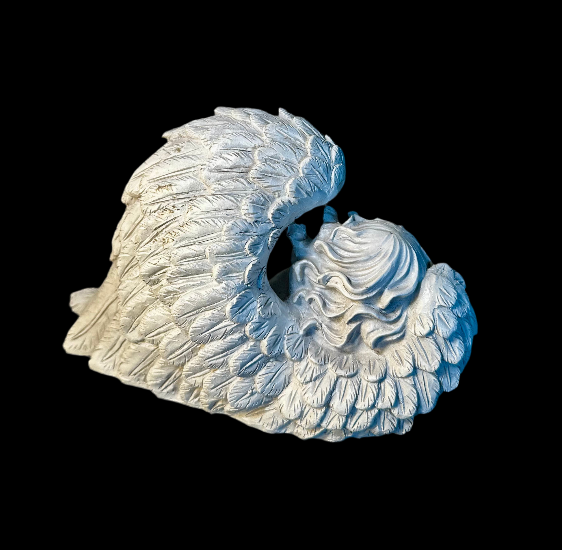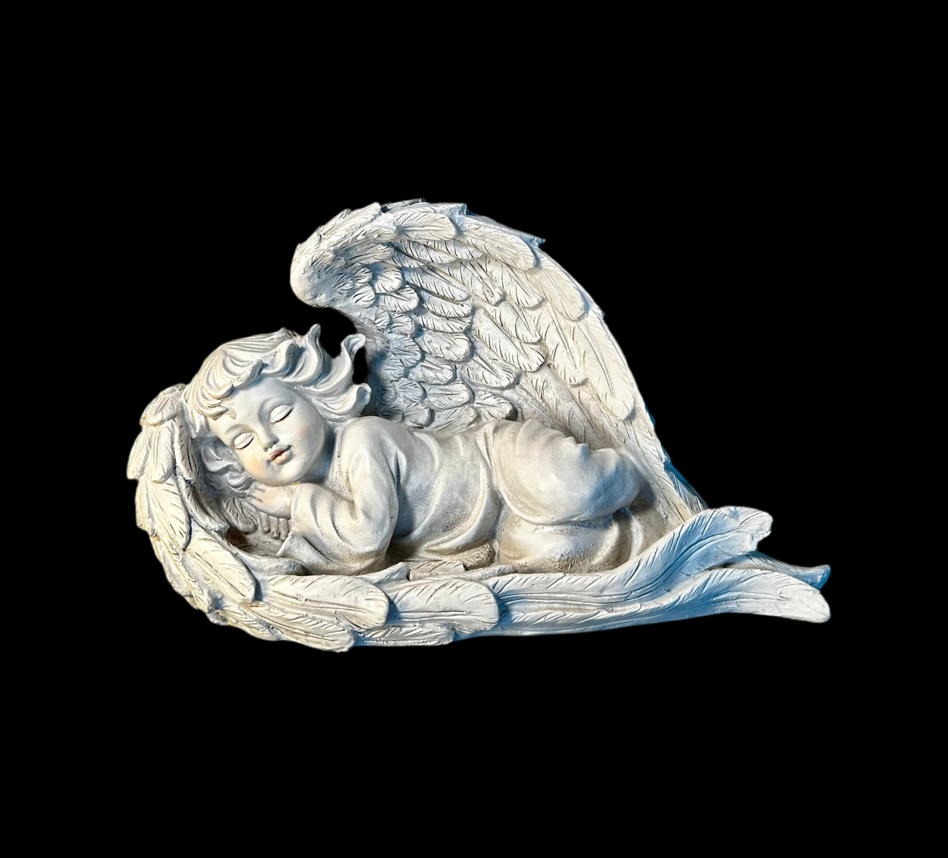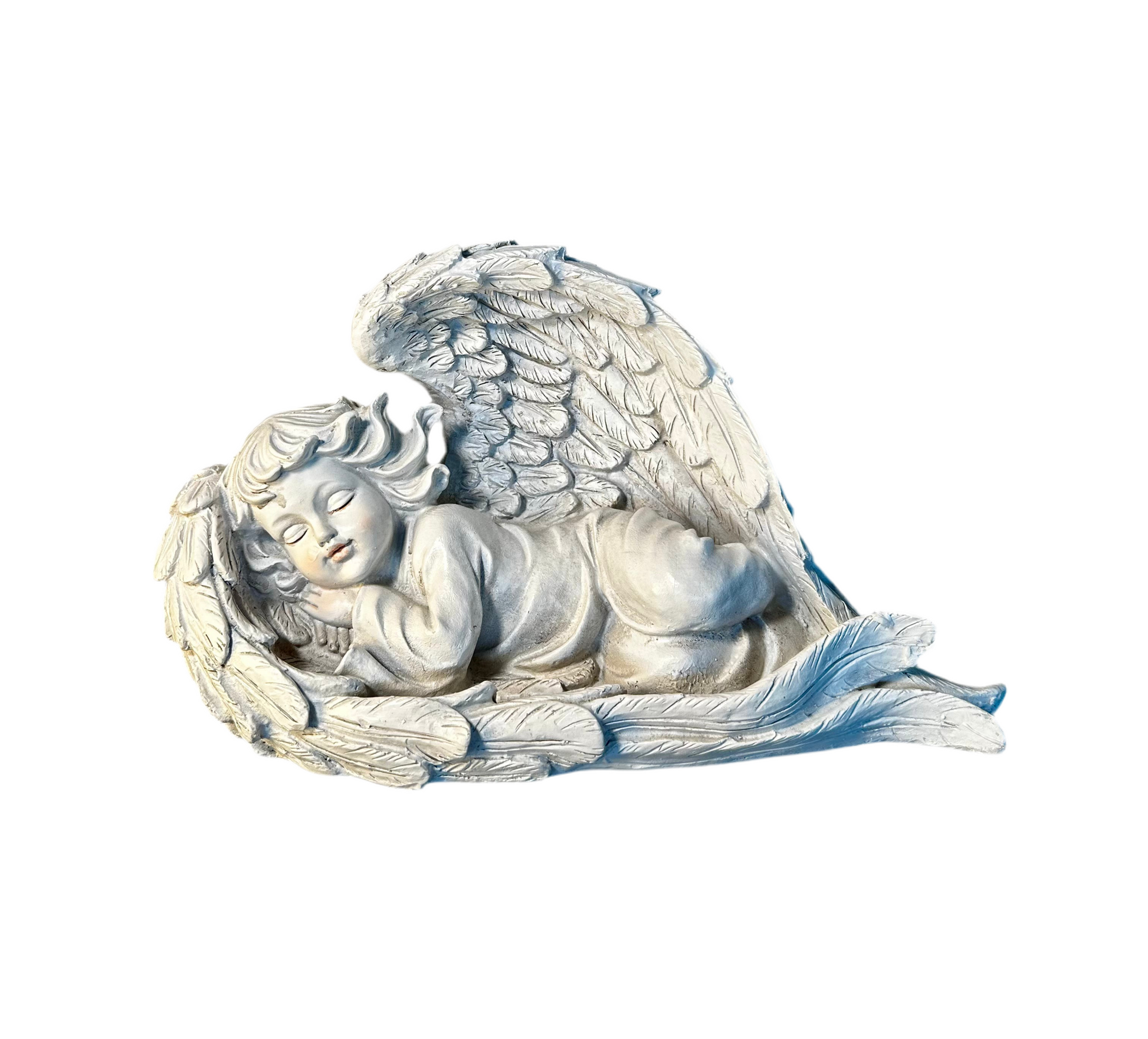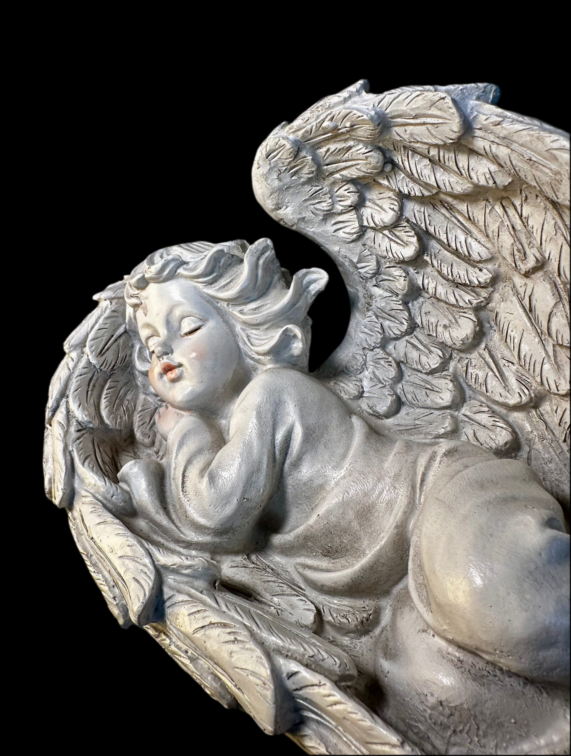 Aniołek leżący na skrzydłach, wykonany z poliuretanu. Wysokość 19 cm i szerokość 32 cm, dzięki czemu doskonale nadaje się na cmentarz, do ozdoby wianka lub jako subtelny akcent w domu. Figurka tworzy wyjątkowy nastrój, dodając uroku każdej aranżacji.