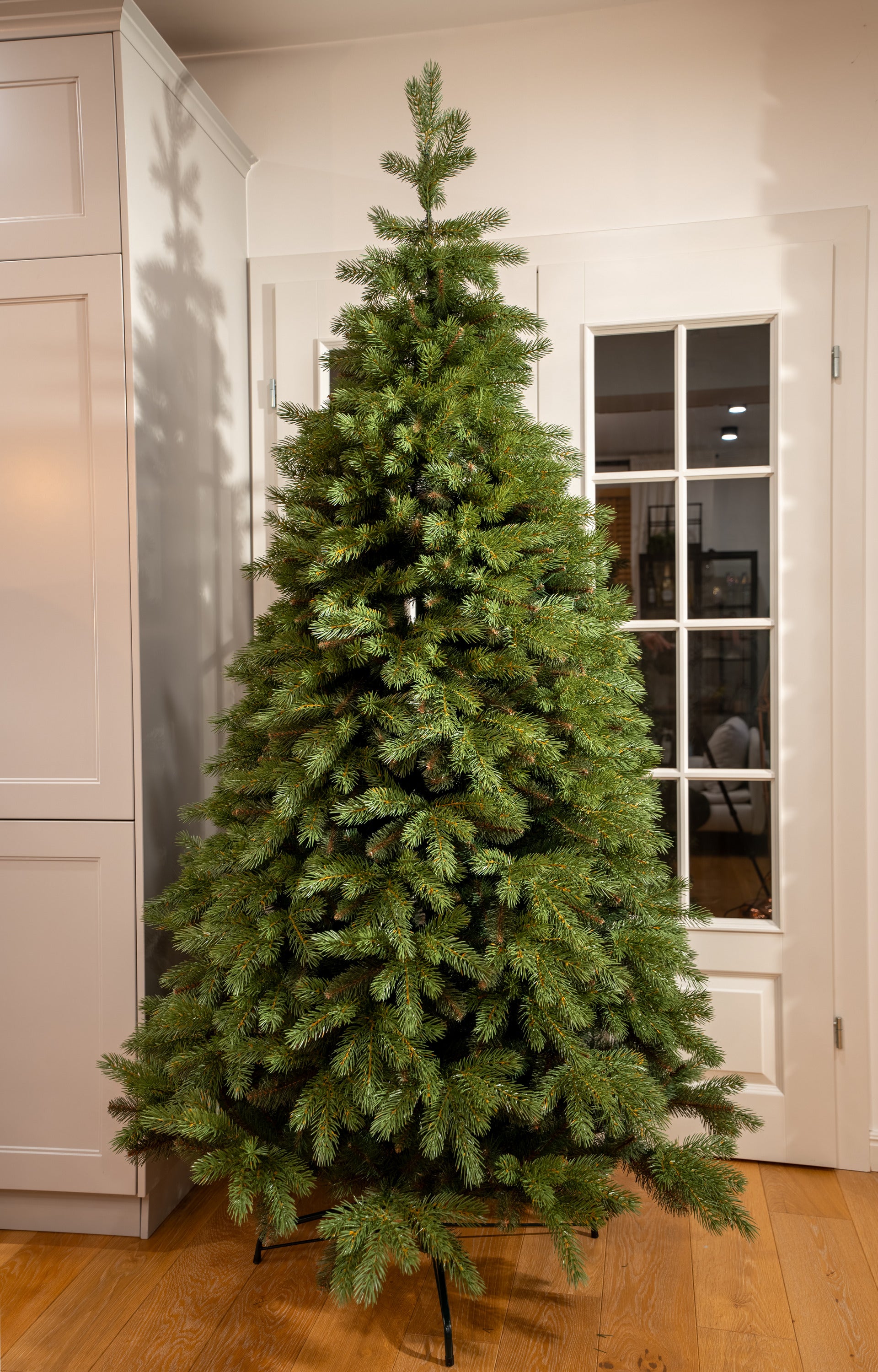Dostępna w trzech wysokościach: 180 cm, 220 cm i 250 cm, świetnie sprawdzi się zarówno w mniejszych, jak i większych pomieszczeniach. Choinka jest stabilna i łatwa do złożenia, a do zestawu dołączono czteroramienny metalowy stojak, który zapewnia mocne podparcie. Gałązki są elastyczne i odporne na zginanie, więc łatwo uformujesz je tak, jak chcesz. To doskonały wybór dla osób, które szukają pięknej, trwałej choinki z naturalnym efektem!