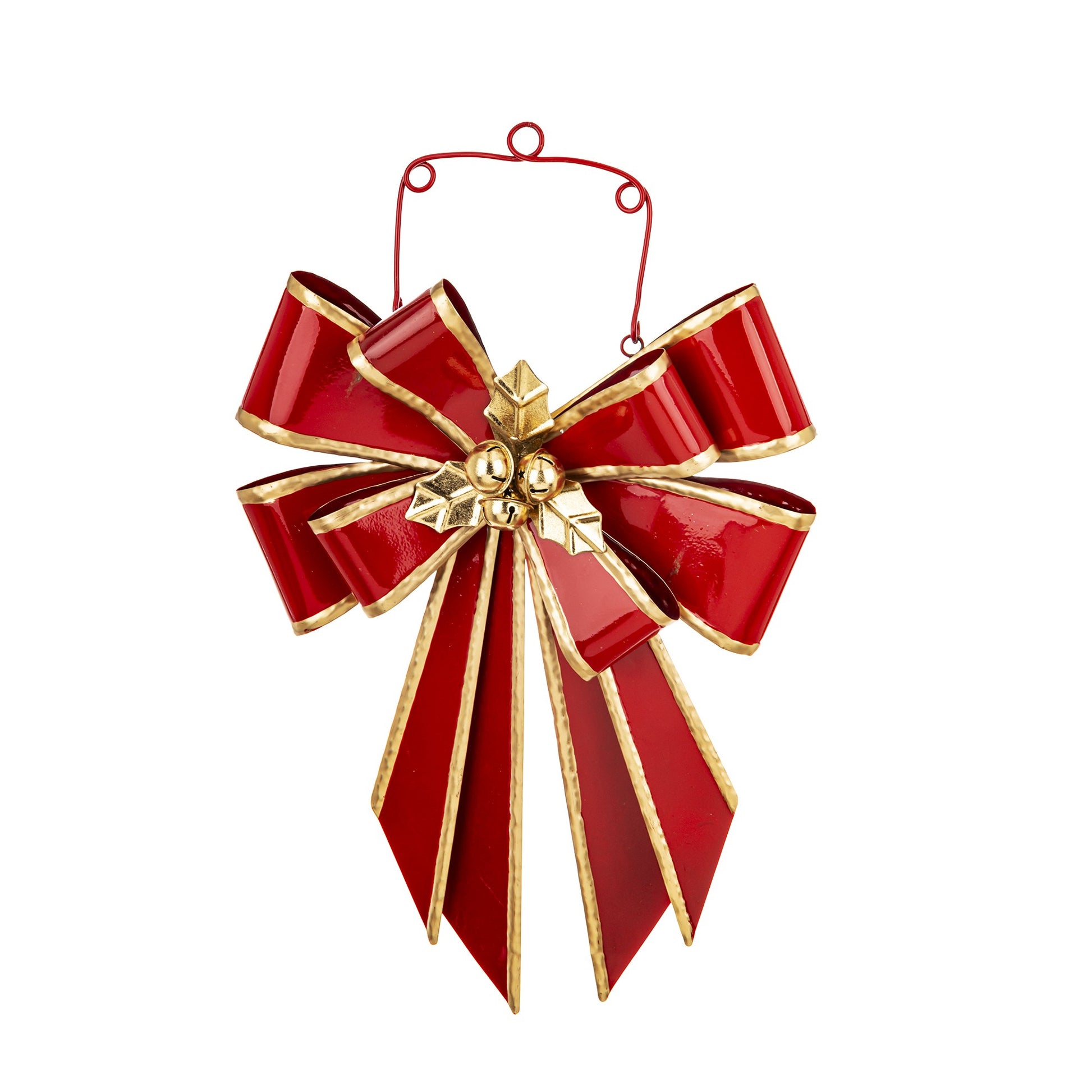 Dekoracyjna kokarda w intensywnej, czerwonej barwie z eleganckimi, złotymi akcentami. Wykonana z metalu, dzięki czemu jest trwała i odporna na warunki atmosferyczne – sprawdzi się zarówno wewnątrz, jak i na zewnątrz. Ozdobiona złotymi listkami i kuleczkami, pięknie podkreśli świąteczny klimat. Idealna do zawieszenia na drzwiach, ścianie, balustradzie czy przy choince.