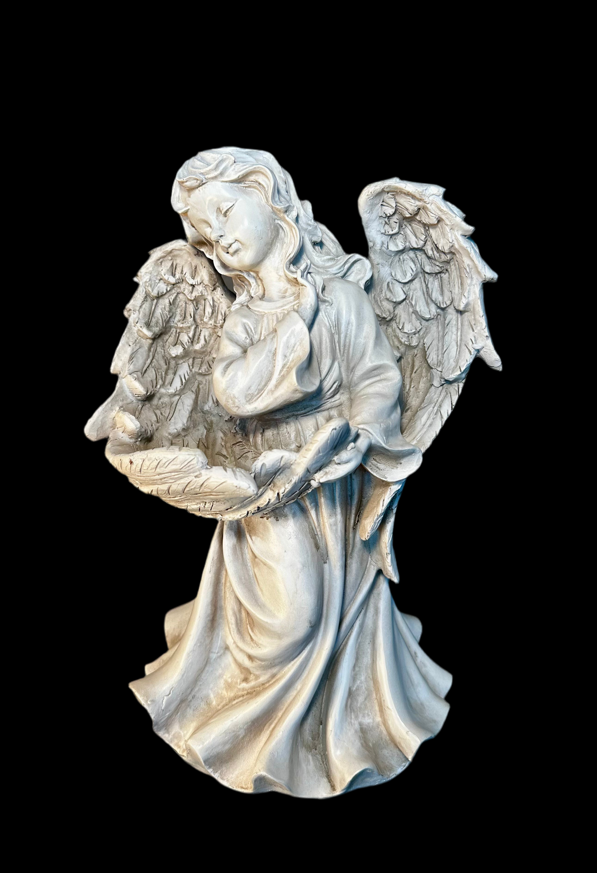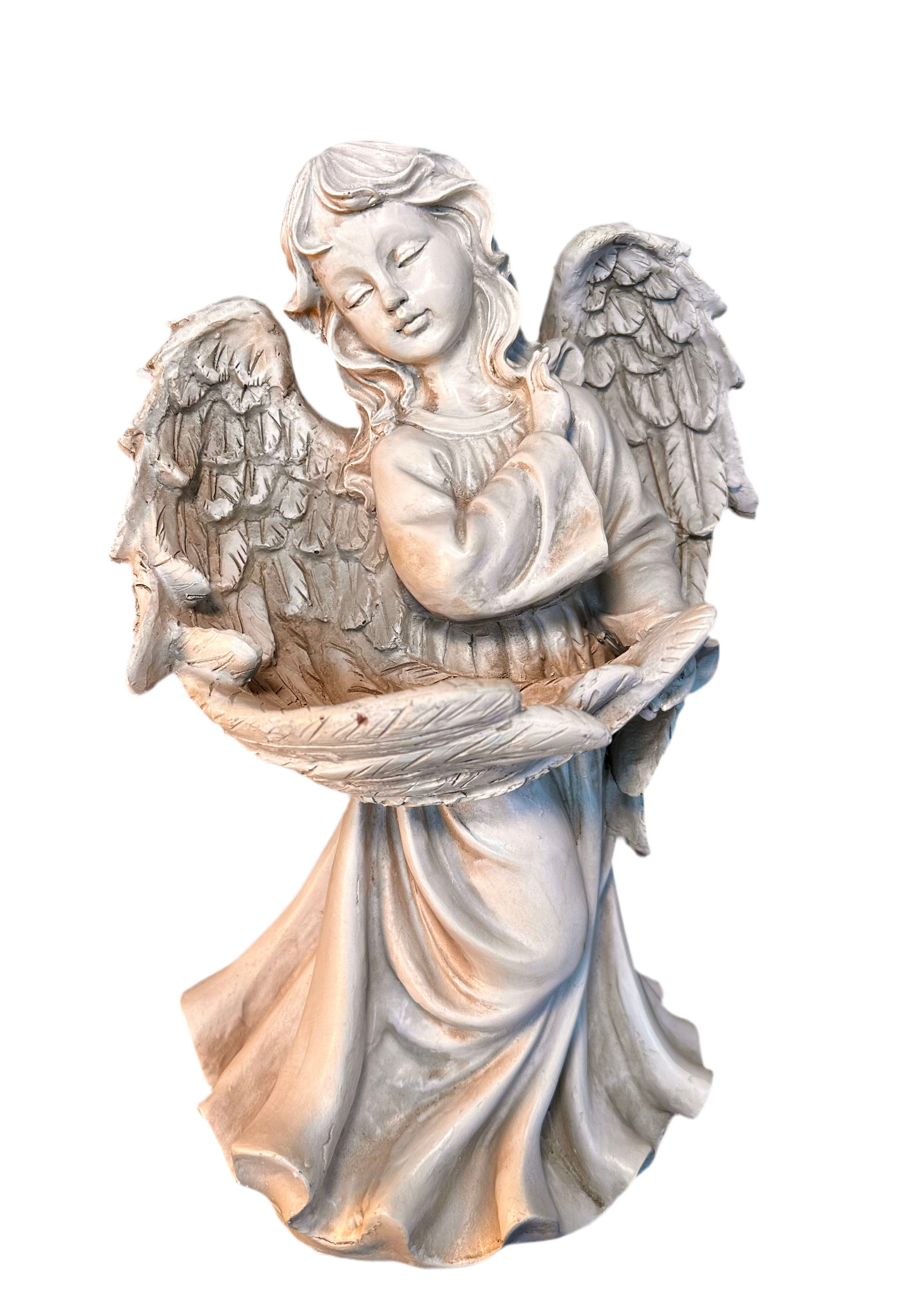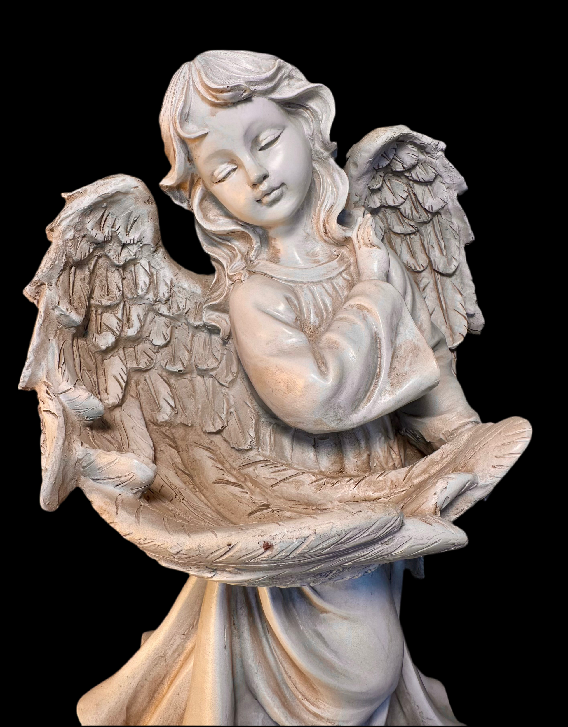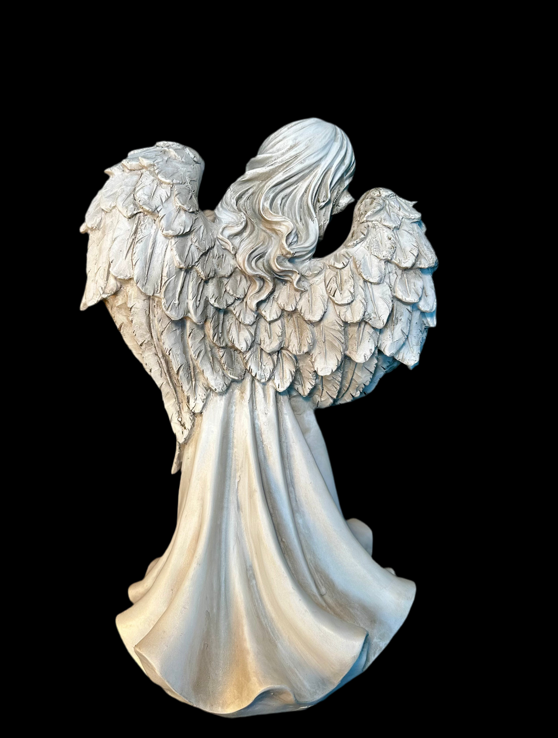 Aniołek otulony skrzydłami wykonany z poliuretanu. Wysokość 38 cm i szerokość 23 cm, dzięki czemu doskonale nadaje się na cmentarz, do ozdoby wianka lub jako subtelny akcent w domu. Figurka tworzy wyjątkowy nastrój, dodając uroku każdej aranżacji.