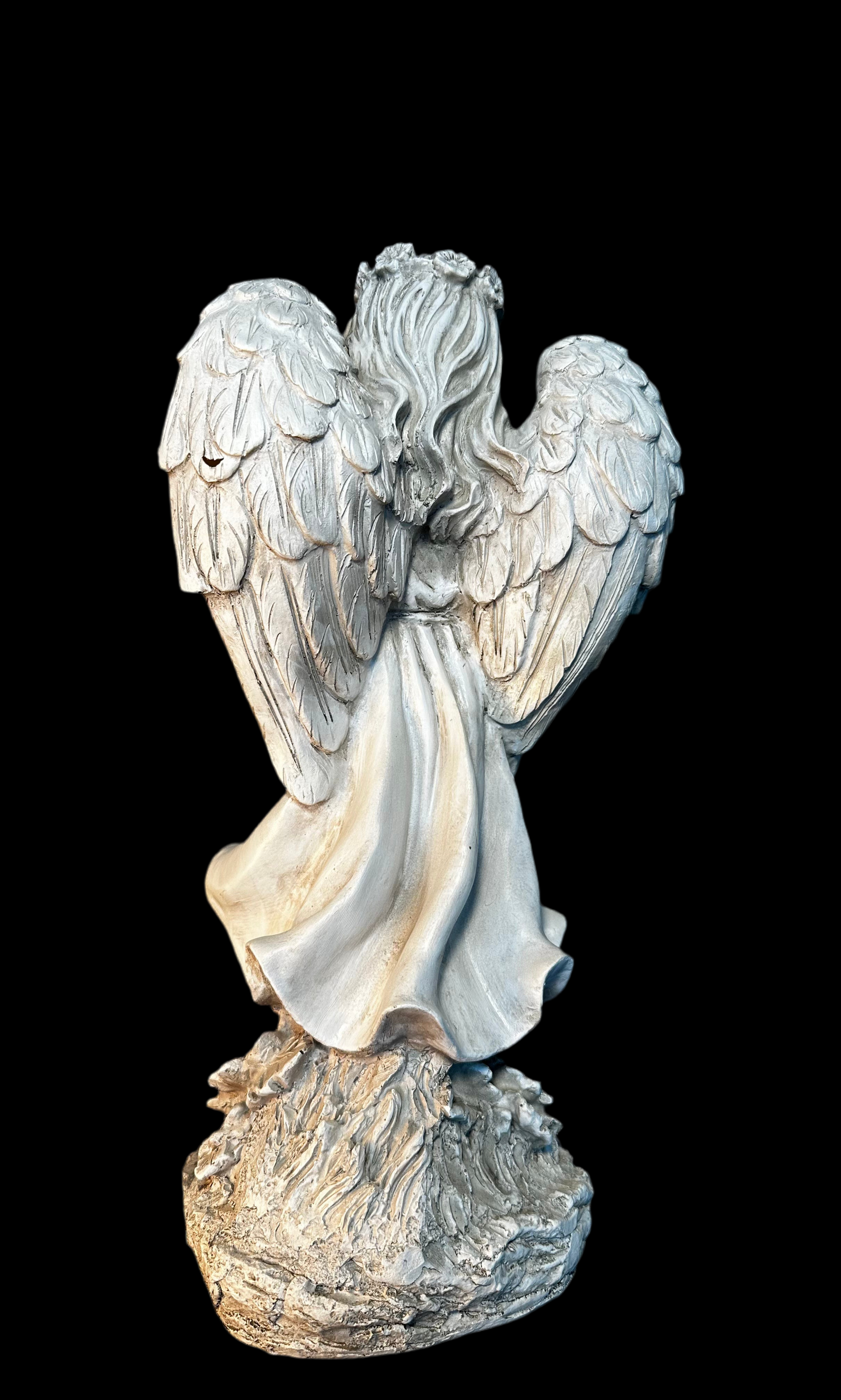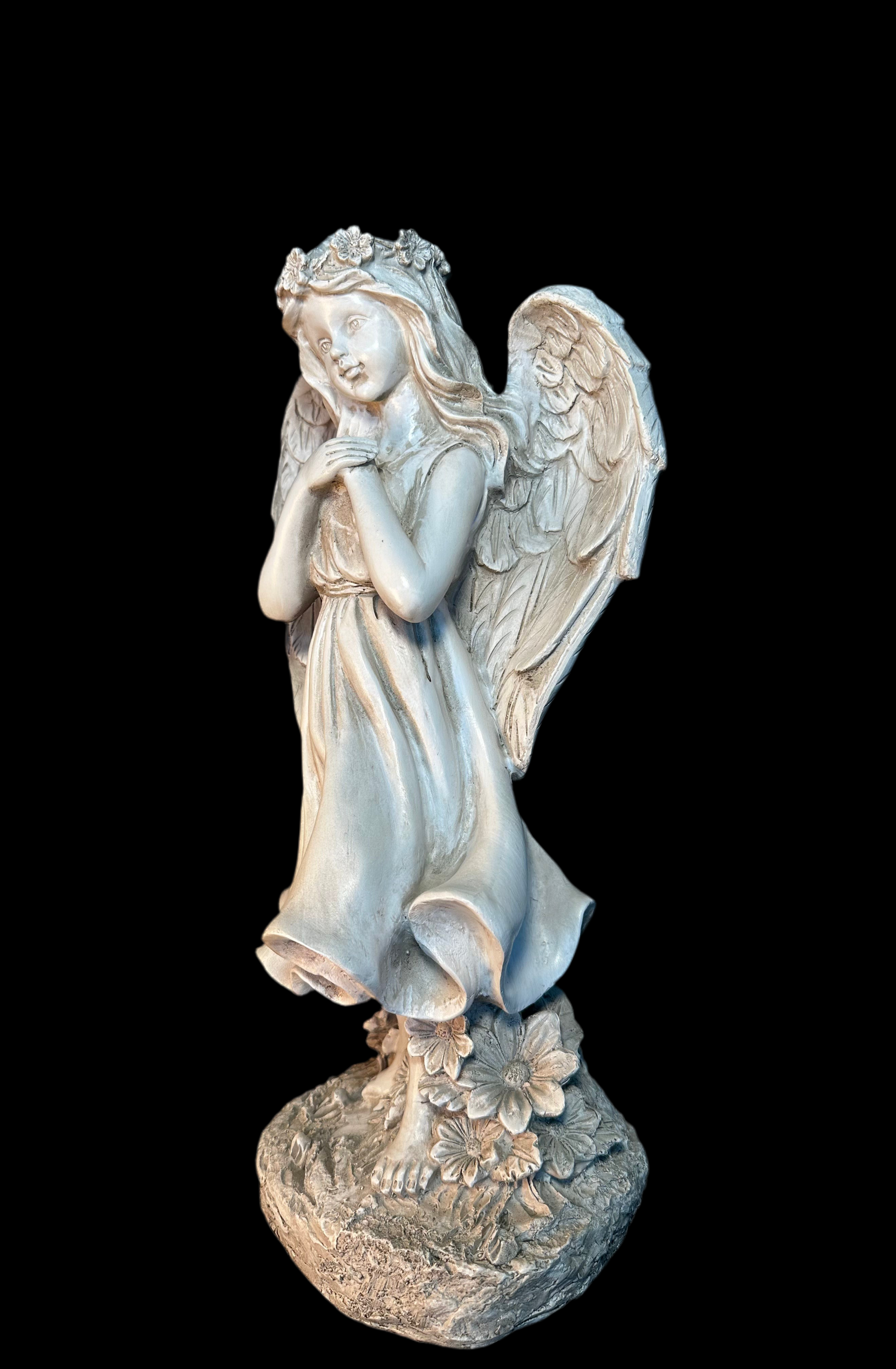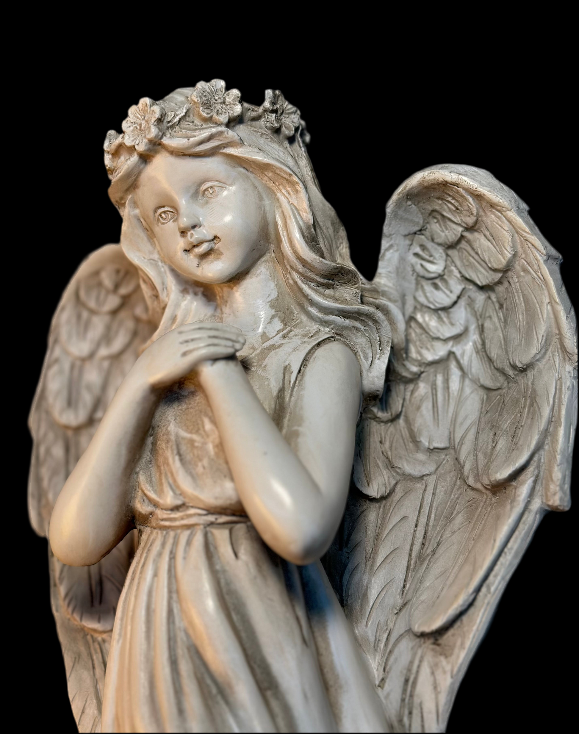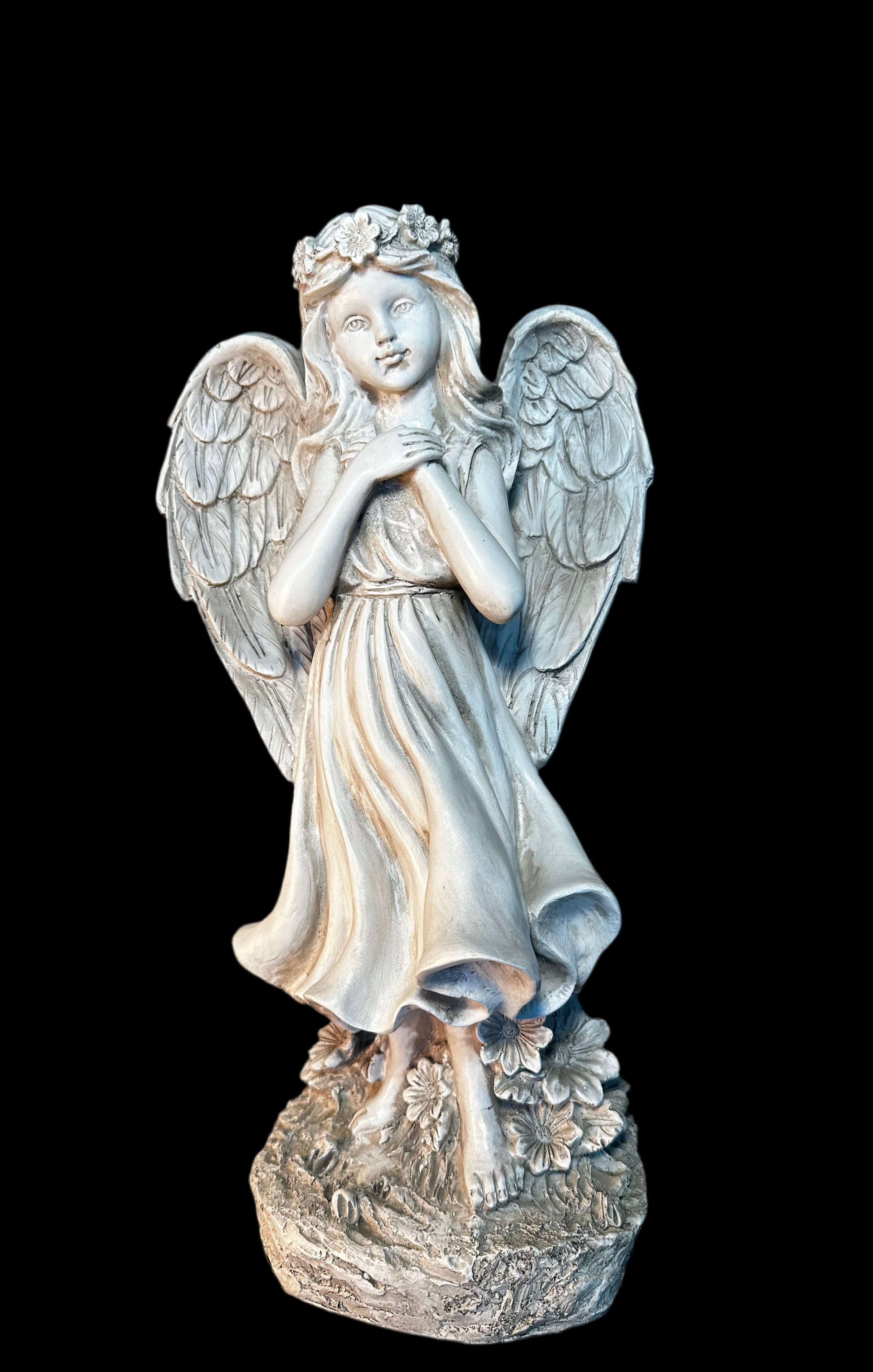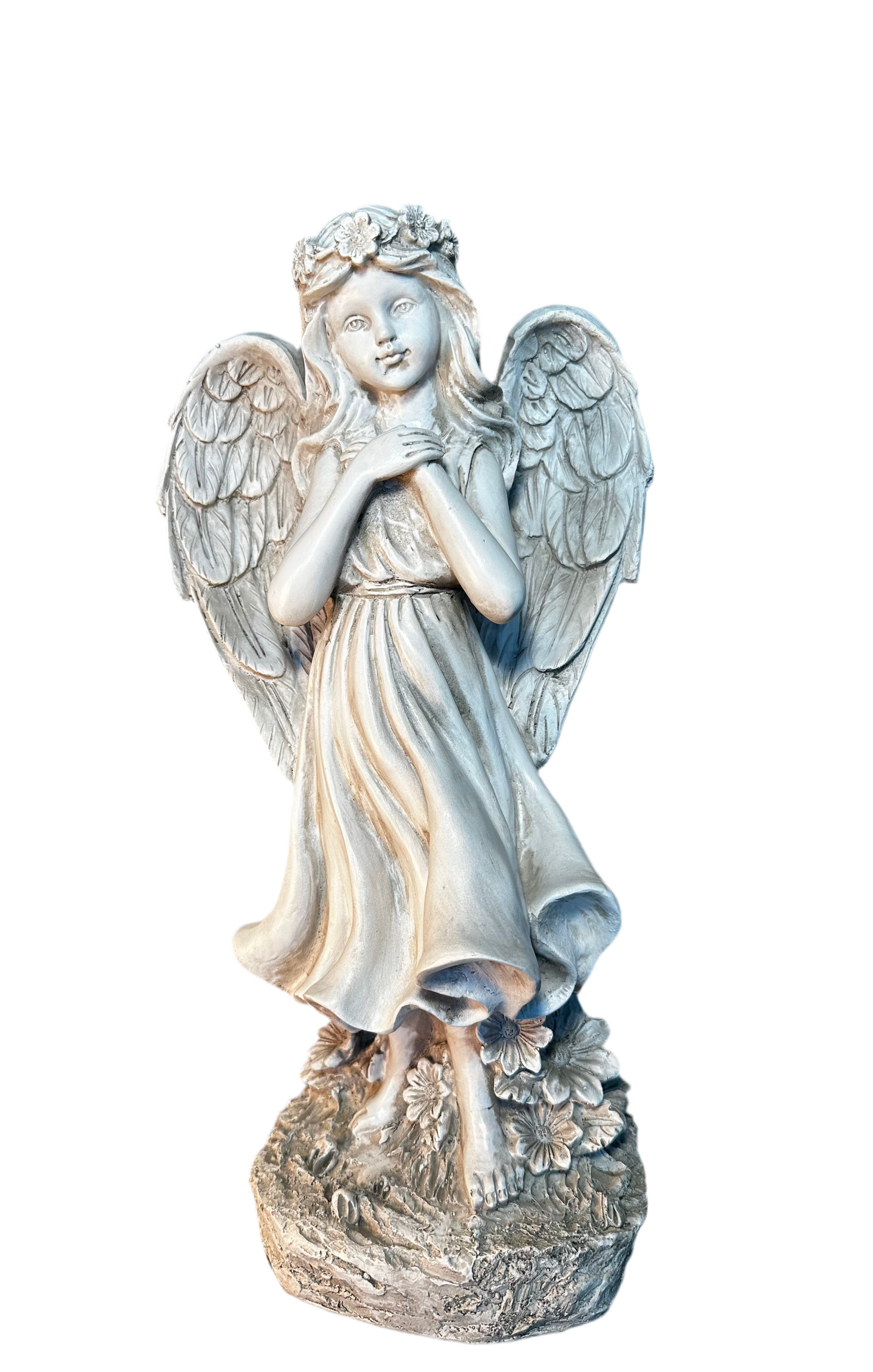Aniołek z kwiatkami wykonany z poliuretanu to idealna dekoracja na cmentarz, symbolizująca pamięć i spokój. Wysokość 43 cm i szerokość 23 cm, dzięki czemu jest stabilny i dobrze widoczny. Figurka jest odporna na warunki atmosferyczne. Anioł tworzy nastrojową atmosferę, dodając blasku każdemu miejscu pamięci.