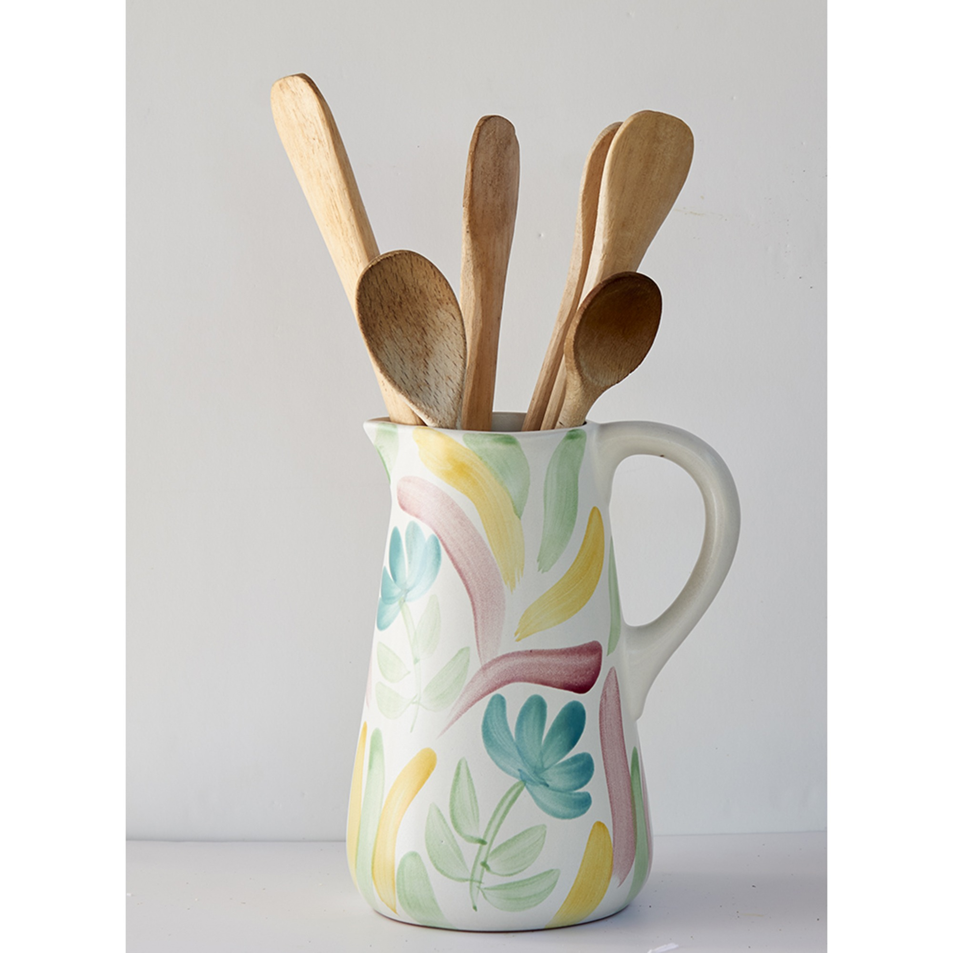 Dzban z terakoty z ręcznie malowanym motywem kwiatowym w wielokolorowej tonacji. Każdy egzemplarz jest unikatowy dzięki ręcznemu wykonaniu i drobnym różnicom w wybarwieniu. Produkt przeznaczony do celów dekoracyjnych, do użytku wewnątrz i na zewnątrz.