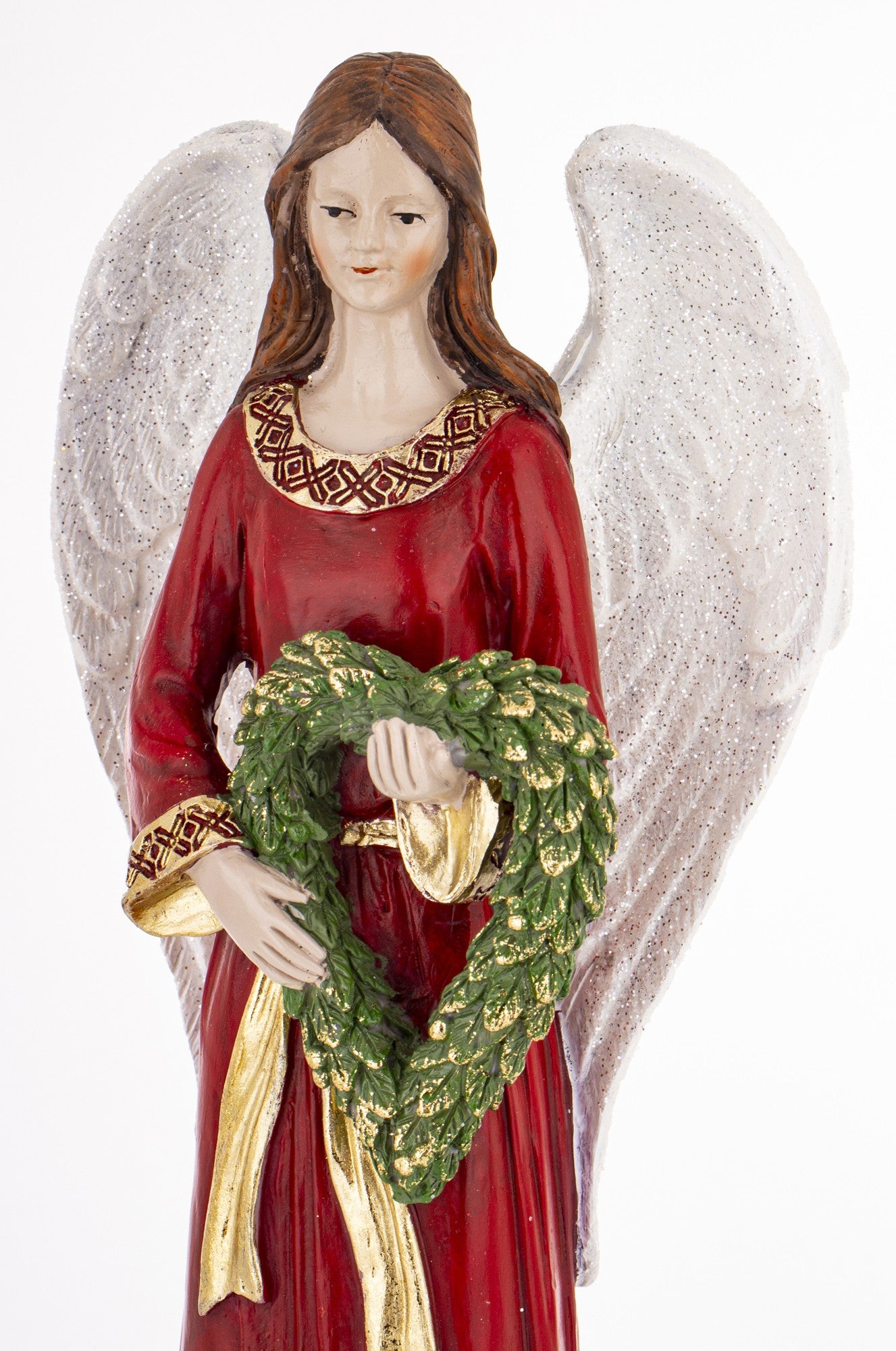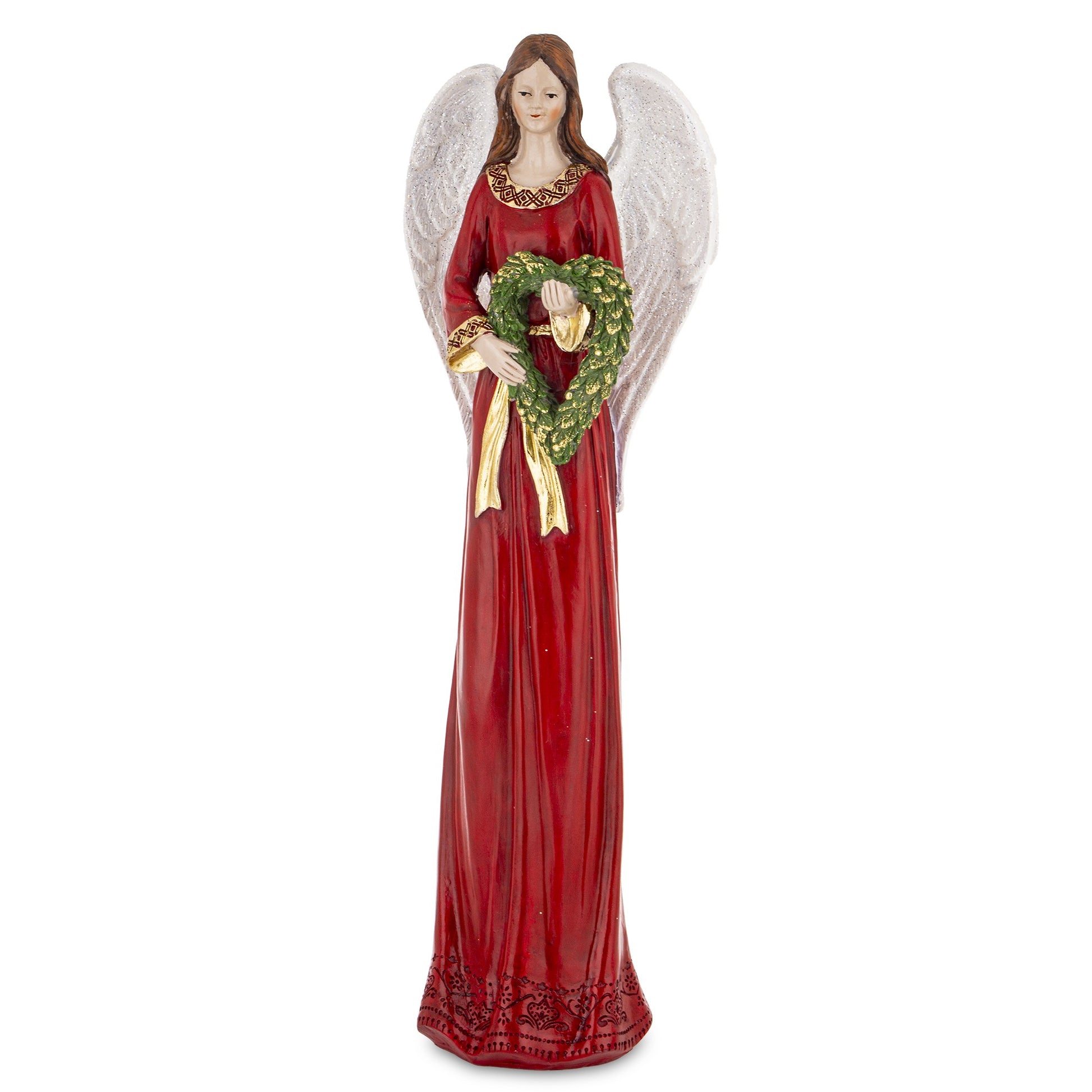 Elegancka figurka anioła w długiej, czerwonej sukni to wyjątkowa ozdoba świąteczna, która doda wnętrzu ciepła i uroku. Anioł trzyma w dłoniach zielony wieniec – symbol nadziei i odrodzenia. Złote detale oraz subtelny połysk sukni nadają dekoracji wyjątkowego, świątecznego charakteru. Idealna na komodę, parapet lub jako ozdoba stołu wigilijnego.