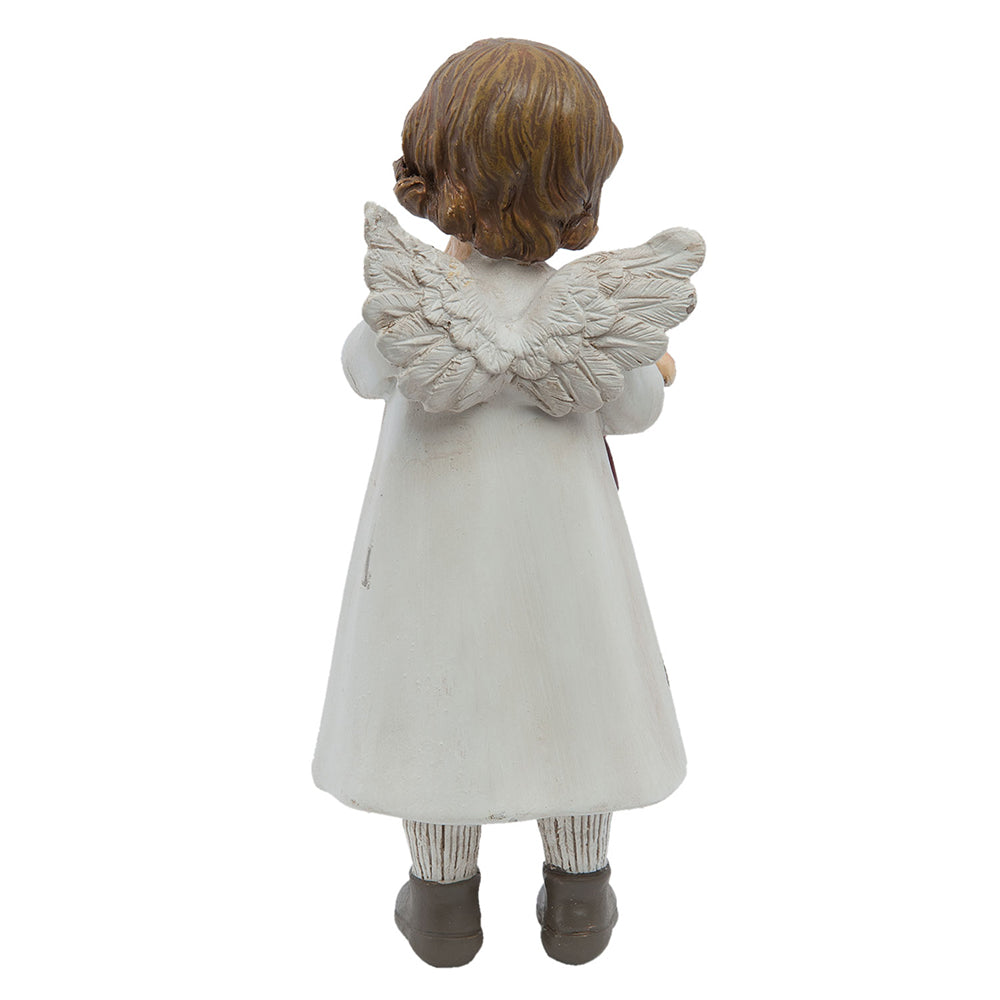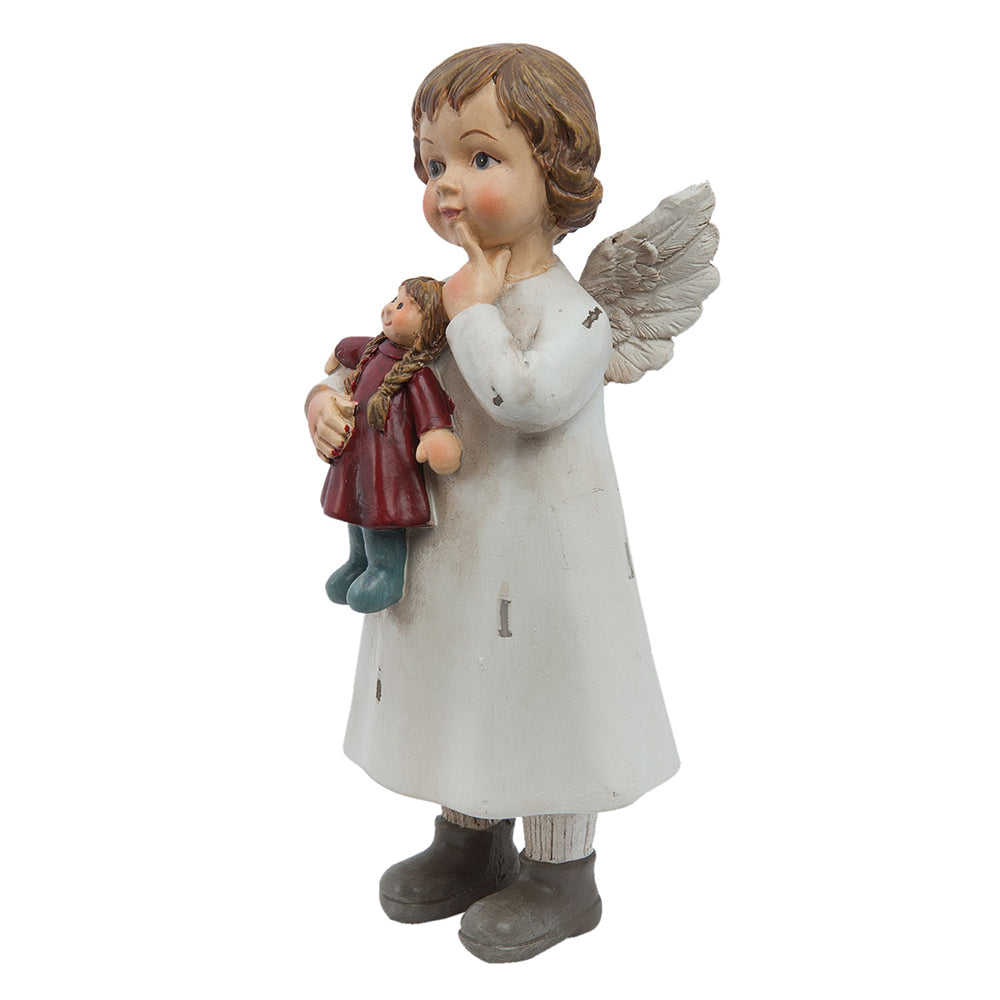 Subtelna figurka anioła, wykonana z trwałego materiału poliresin, wyróżnia się eleganckim, białym wykończeniem oraz klasycznym, ponadczasowym designem.
