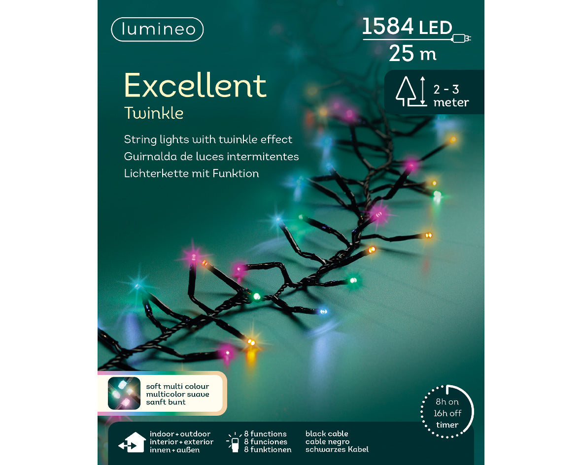 Wyjątkowo gęste i długie lampki LED o długości aż 25 metrów i aż 1584 diodach LED w wersji soft multi – delikatne, pastelowe kolory idealne do tworzenia nastrojowego klimatu. Dzięki rozstawowi co 1,6 cm, ten zestaw zapewnia intensywny efekt świetlny na dużej powierzchni. Lampki idealnie sprawdzą się na choinkach o wysokości 2-3 metrów.