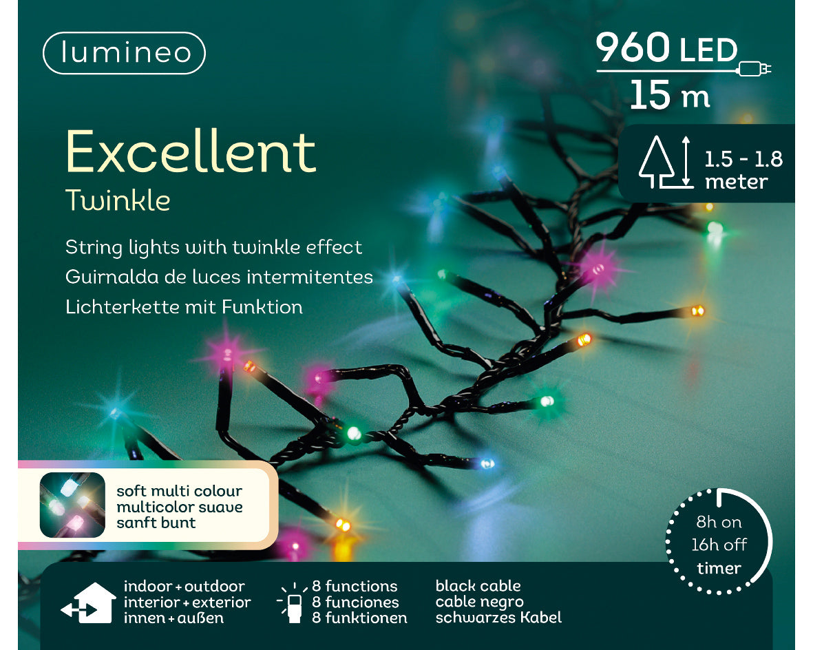 Lampki LED 960L – 15 m, soft multi, czarny przewód, zewnętrzne – Lumineo