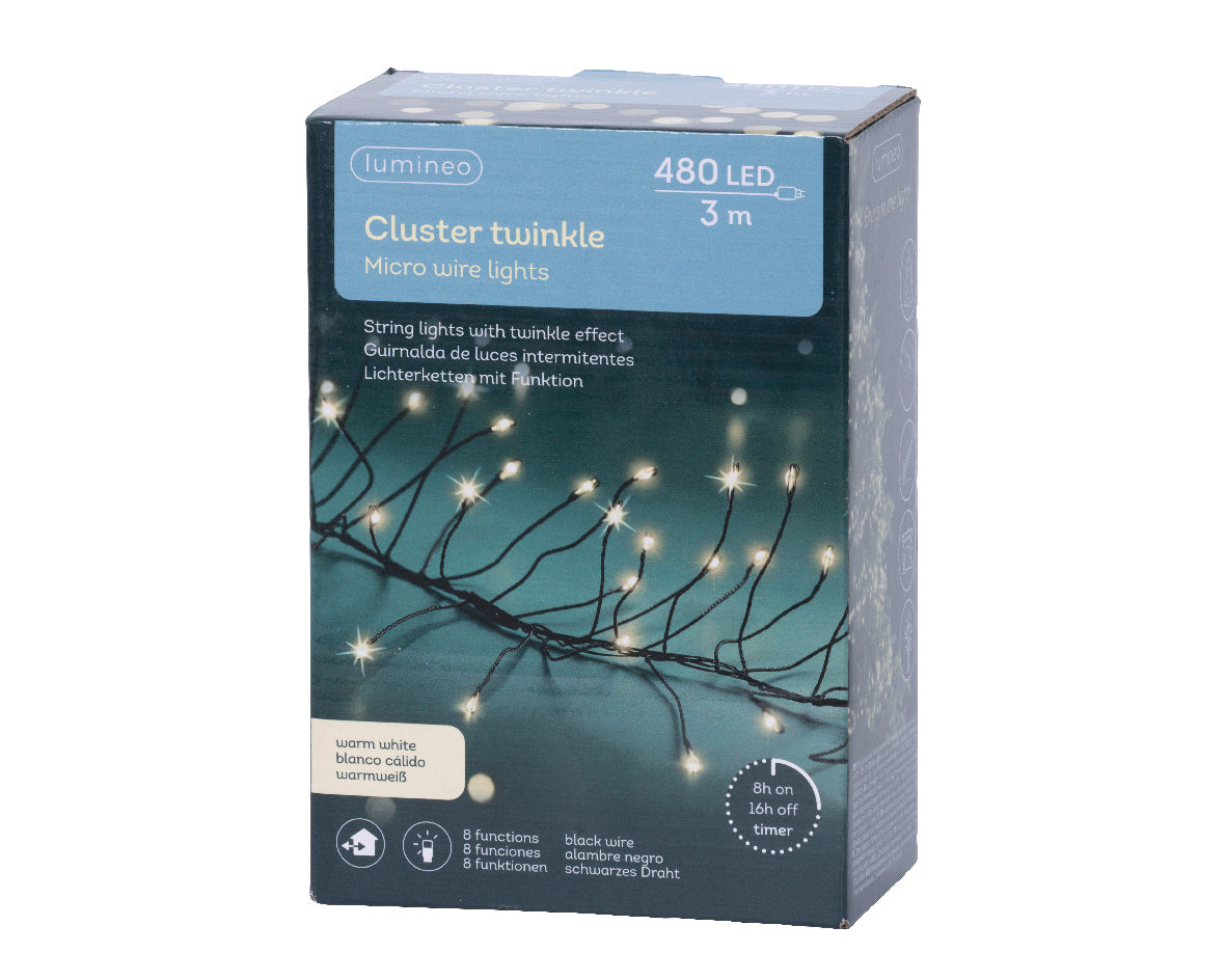 Kurtyna świetlna LED 480L – 3 m, czarny przewód, ciepła biel, zewnętrzna – Lumineo