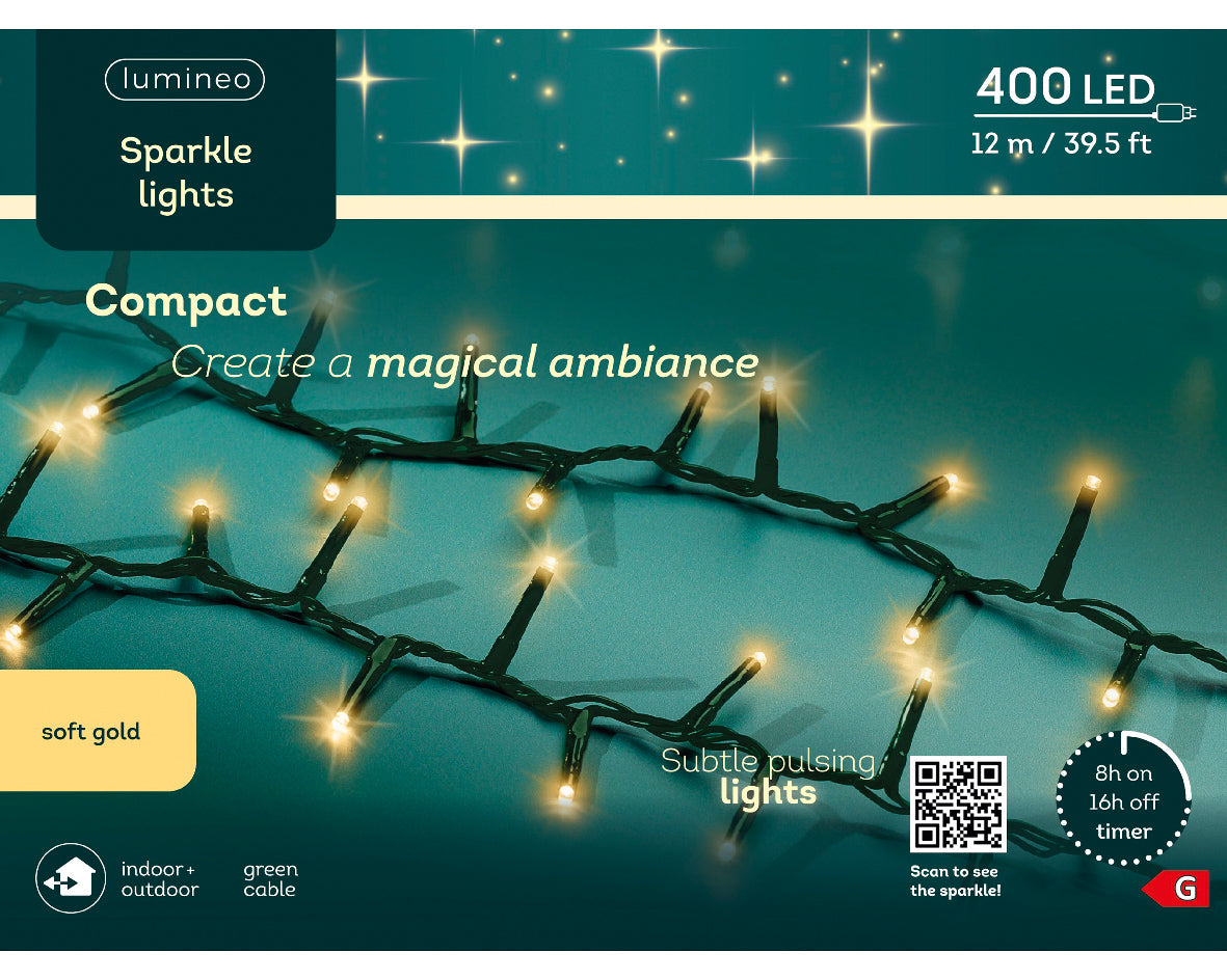 Eleganckie lampki LED o subtelnym, delikatne złoto z delikatnym efektem migotania (sparkle effect). Zestaw zawiera 400 diod LED rozmieszczonych na 12 metrach świecącej długości, dzięki czemu idealnie nadają się do dekorowania średnich choinek, balustrad, krzewów ogrodowych i elementów elewacji.