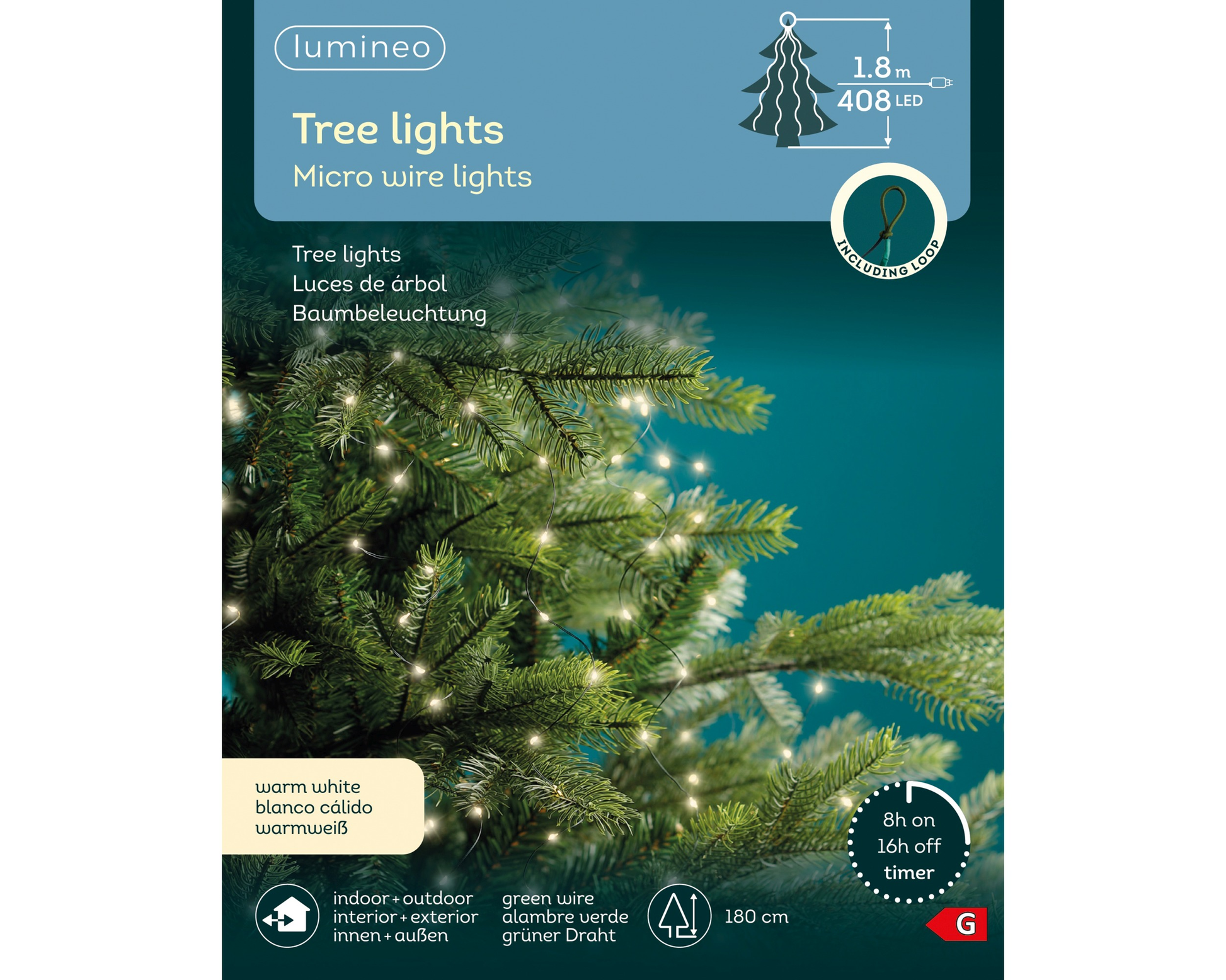 Ciepłe lampki choinkowe Micro LED marki Lumineo na zielonym druciku o długości 1,8 m z 408 diodami LED to doskonały wybór do dekoracji drzewek o wysokości od 1,5 do 1,8 m. Emitują przyjemne, ciepłe światło, które wprowadzi wyjątkowy, świąteczny nastrój do każdego wnętrza.