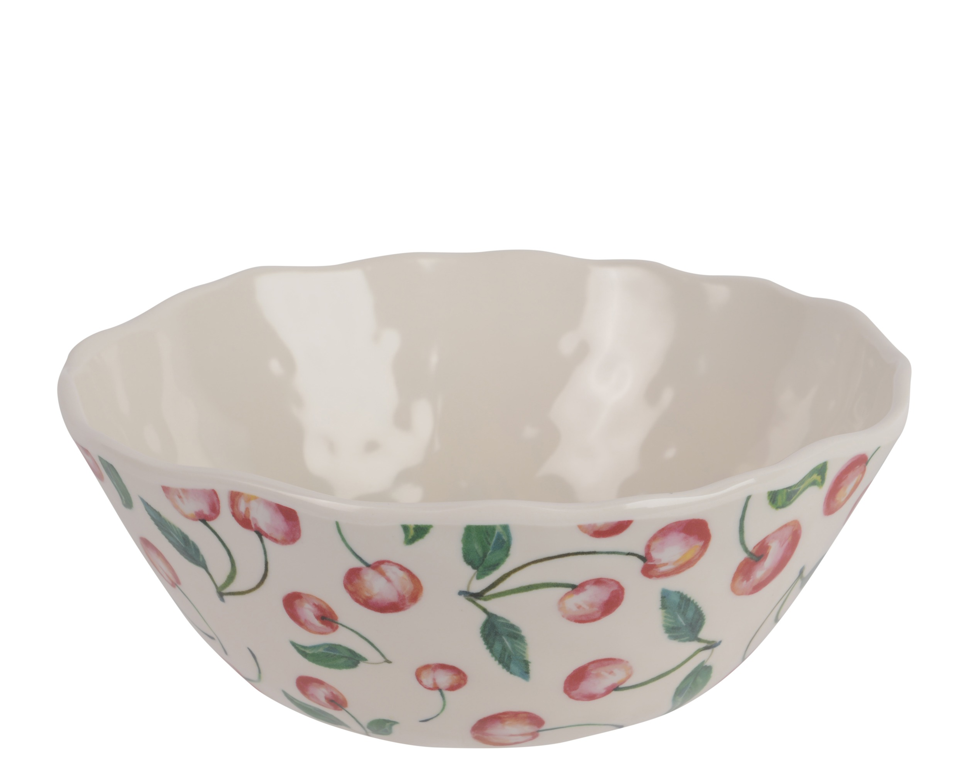 Okrągła miska wykonana z melaminy w białym kolorze z dekoracyjnym wzorem wiśni.