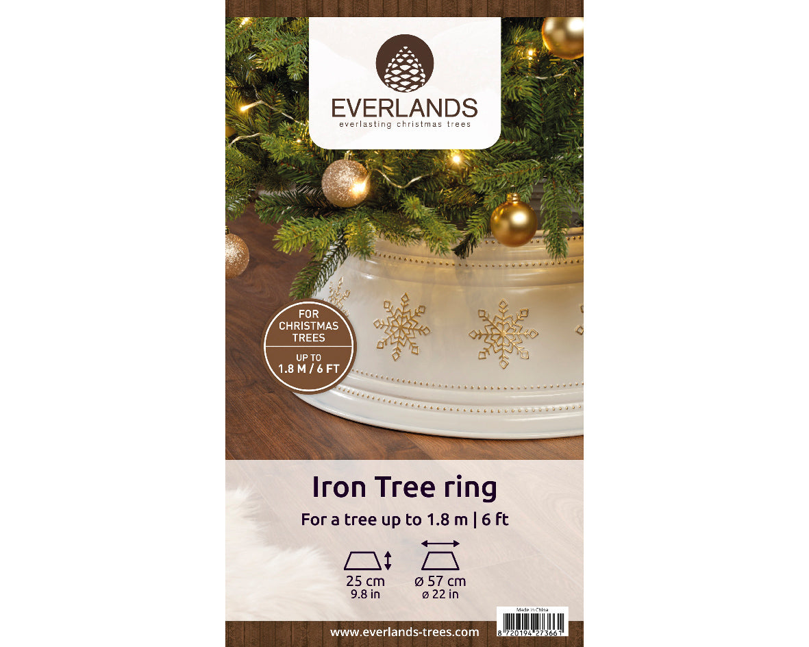 Elegancka, metalowa osłona na stojak choinki w białym kolorze z delikatnymi, złotymi akcentami. Dodaje drzewku świątecznemu luksusowego i wyrafinowanego wyglądu, skutecznie maskując podstawę. Wykonana z trwałego żelaza, idealnie sprawdzi się zarówno w domu, jak i w eleganckich przestrzeniach komercyjnych, takich jak hotele, restauracje czy recepcje.