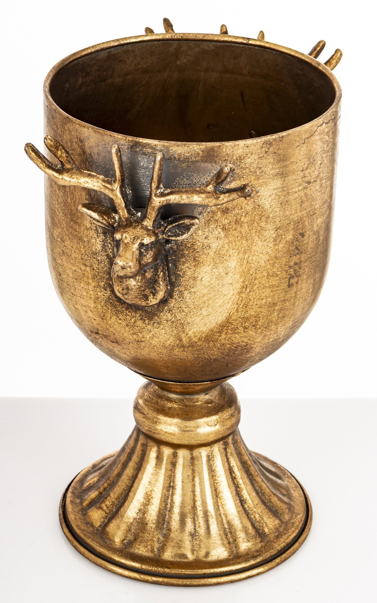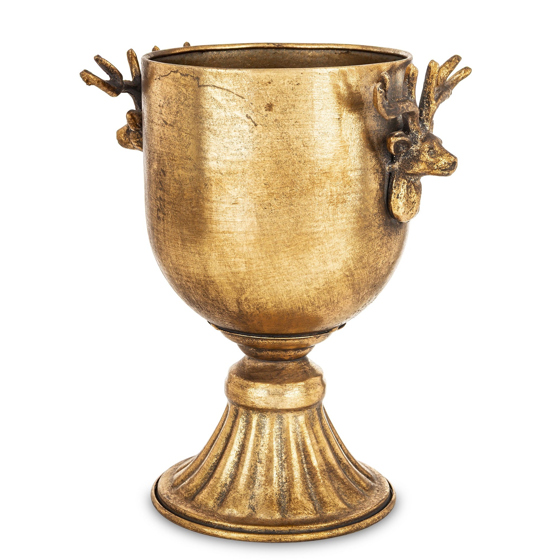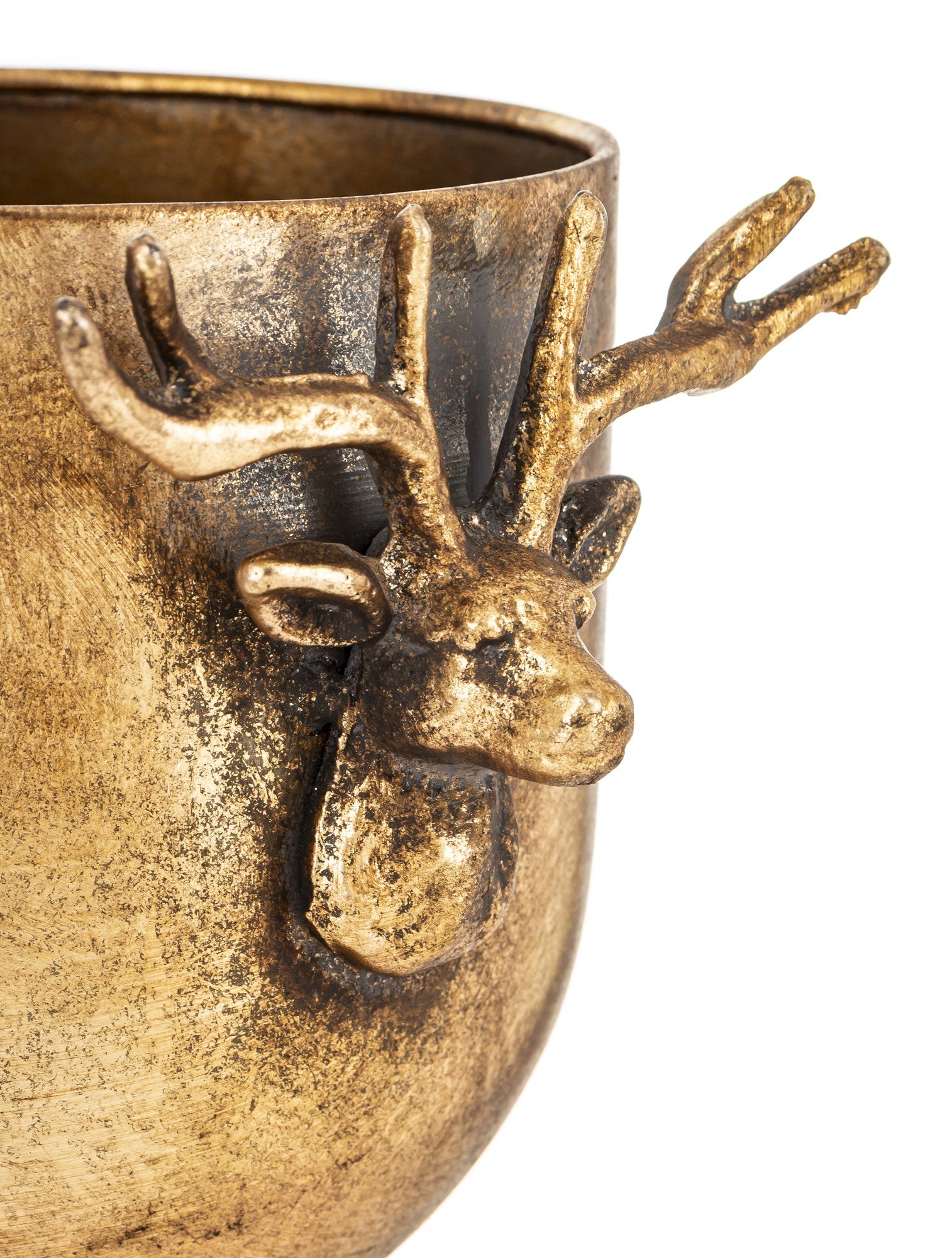 Stylowa, złota osłonka na nodze to wyjątkowa dekoracja, która doda wnętrzu elegancji i świątecznego charakteru. Wykonana z metalu, posiada delikatne postarzenia, które podkreślają jej rustykalny urok. Po bokach zdobią ją uchwyty w kształcie głowy jelenia — subtelny, ale efektowny detal idealny do zimowych aranżacji.