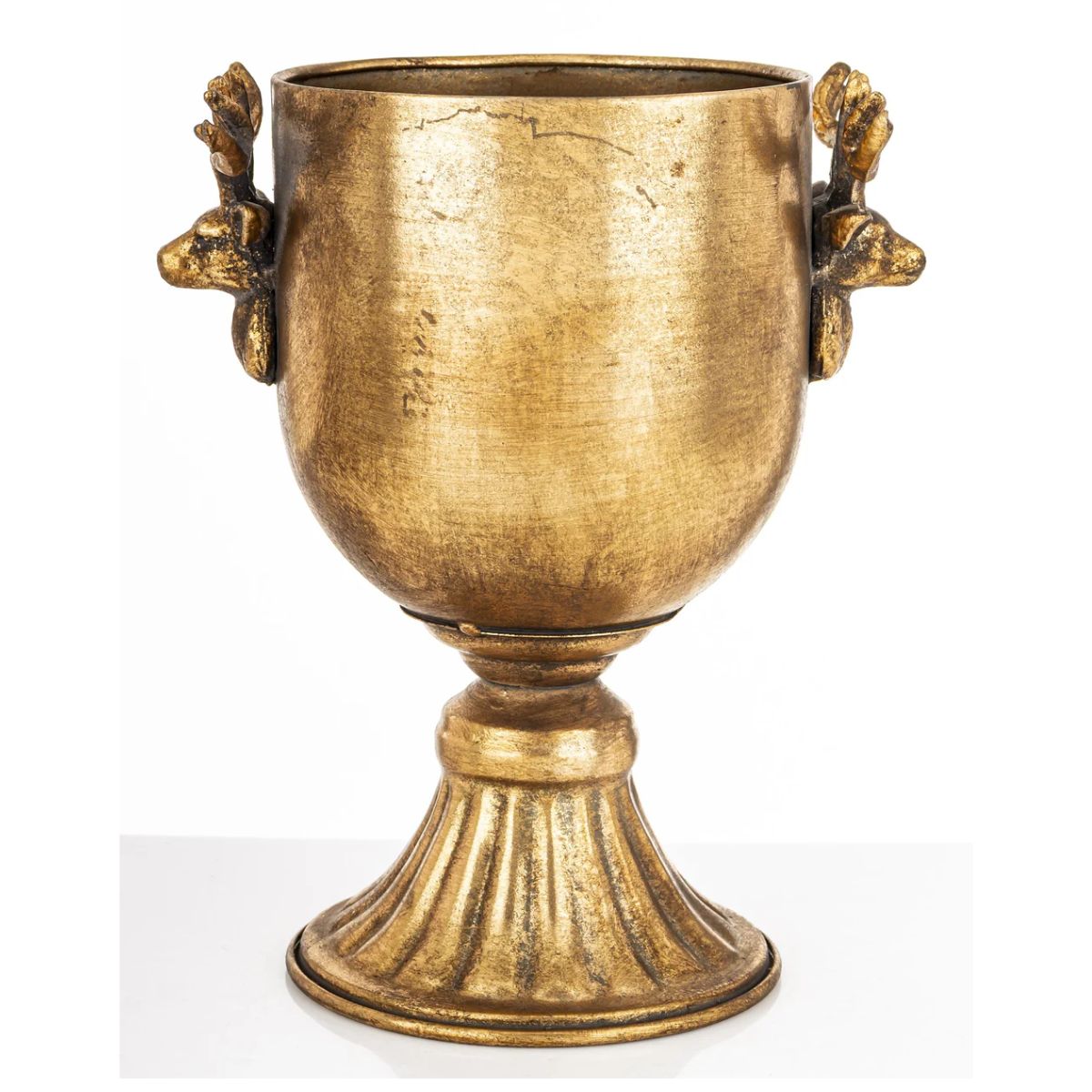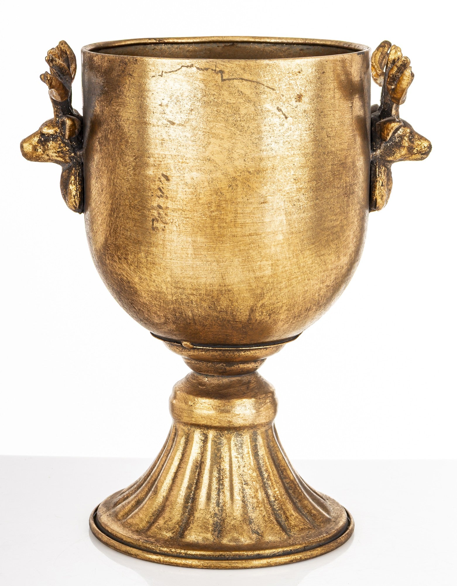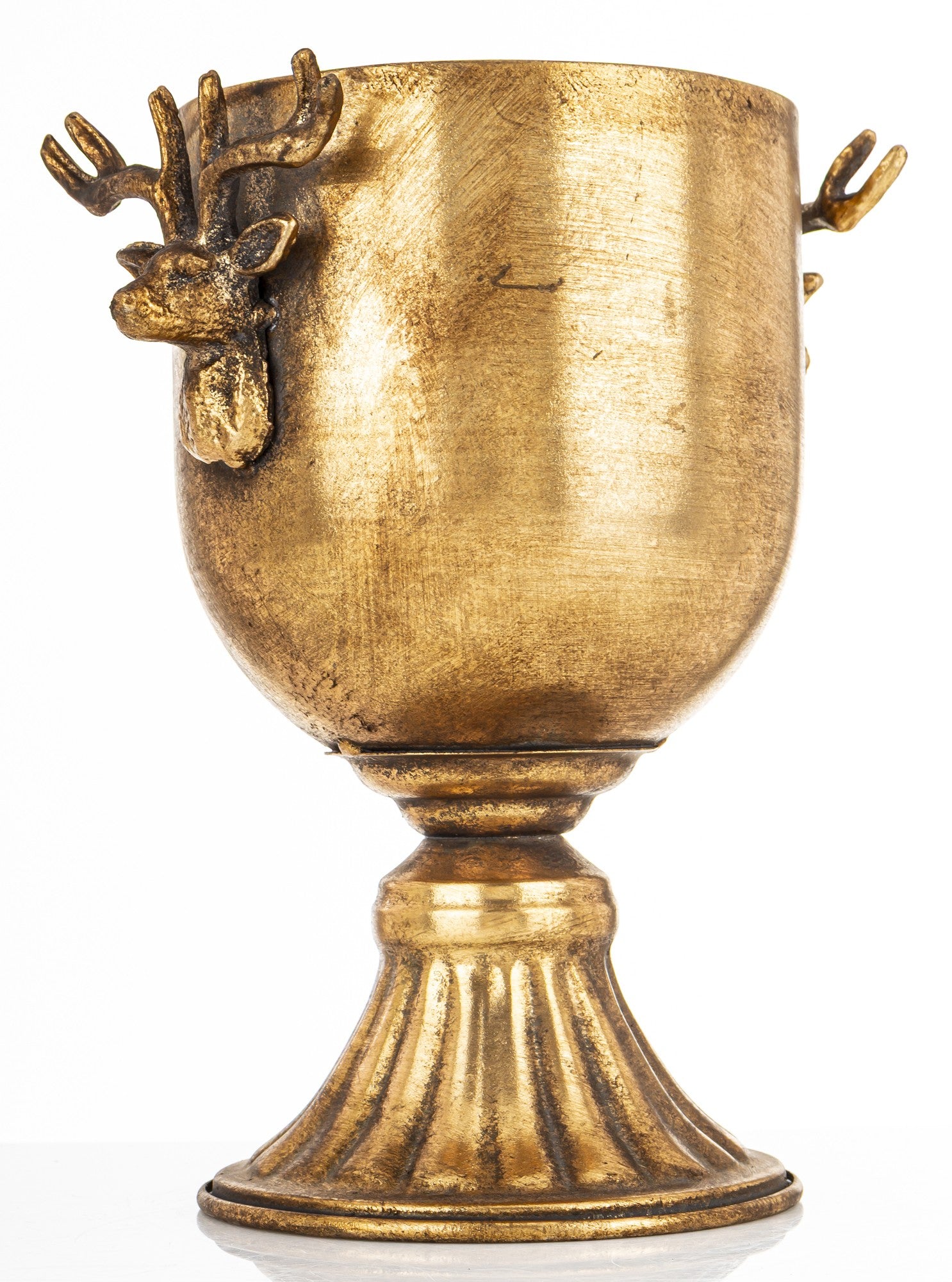 Stylowa, złota osłonka na nodze to wyjątkowa dekoracja, która doda wnętrzu elegancji i świątecznego charakteru. Wykonana z metalu, posiada delikatne postarzenia, które podkreślają jej rustykalny urok. Po bokach zdobią ją uchwyty w kształcie głowy jelenia — subtelny, ale efektowny detal idealny do zimowych aranżacji.