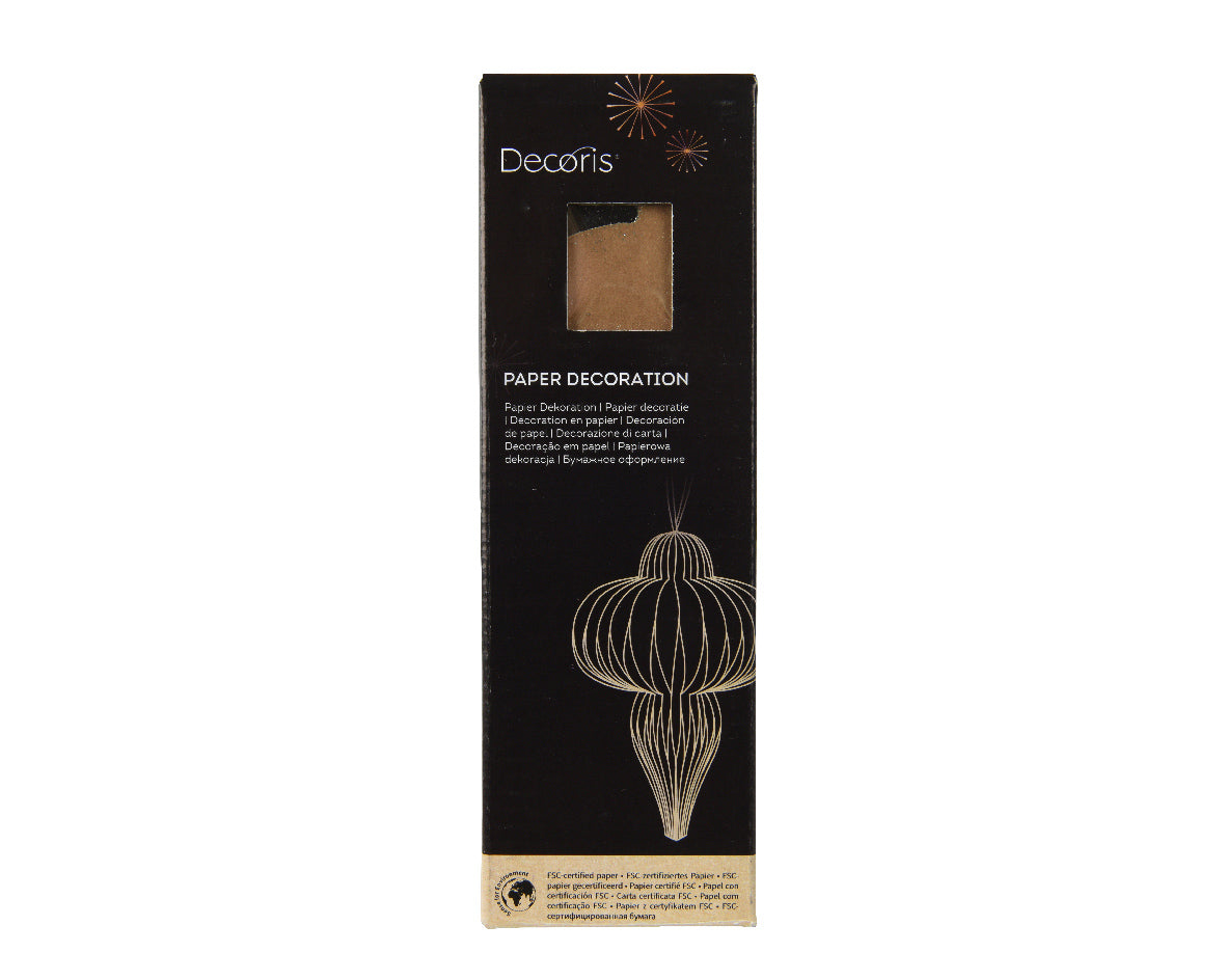 Stylowa ozdoba świąteczna z papieru w głębokim brązowym kolorze, ozdobiona subtelnym złotym brokatem. Jej kształt przypominający elegancką cebulkę przyciąga uwagę i wprowadza do wnętrza wyjątkowy, świąteczny klimat. Wykonana w 100% z certyfikowanego papieru FSC – jest nie tylko efektowna, ale i ekologiczna.