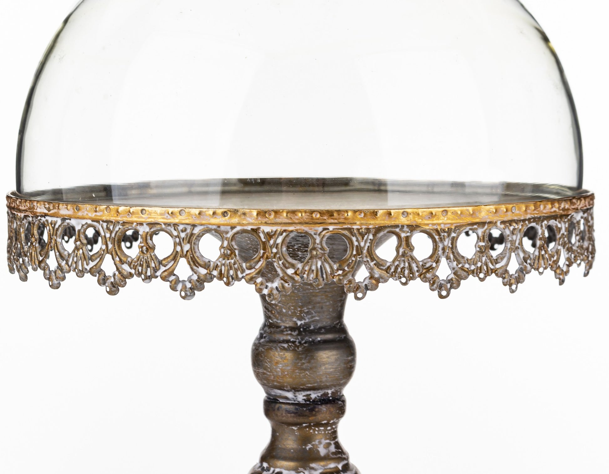 Wyjątkowa patera dekoracyjna z przykrywką to elegancki element, który doda wnętrzu klasy i szyku. Wykonana z połączenia metalu i szkła, zachwyca starannie zdobioną podstawą w kolorze antycznego złota oraz delikatną, szklaną kopułą z uchwytem.
