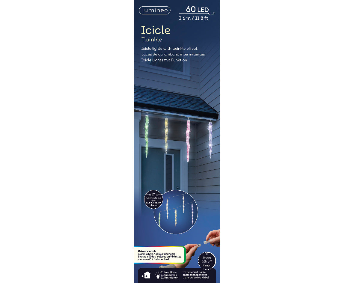 Lampki LED Sople 60L – 3,6 m – Ciepły biały / zmieniający kolor – Transparentny przewód – Lumineo