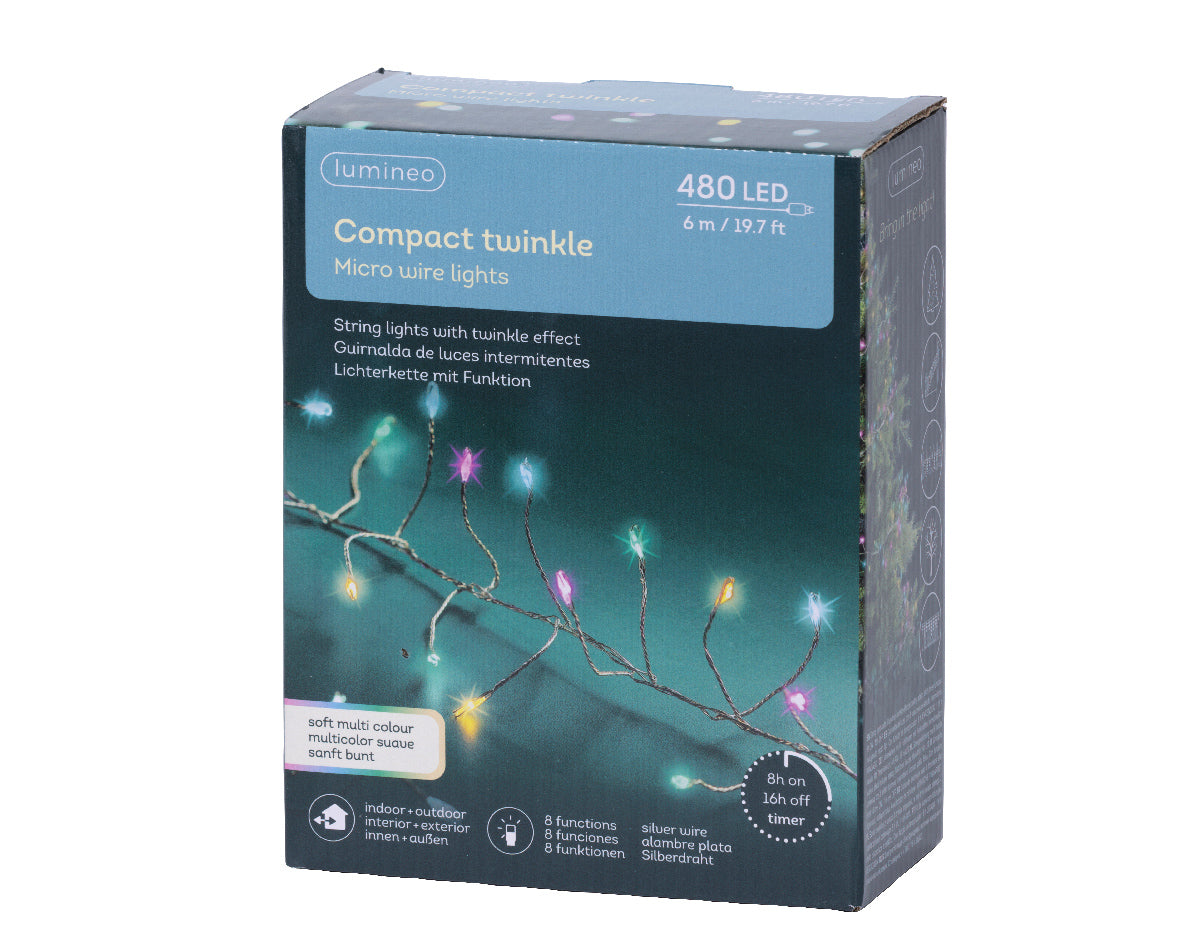 6-metrowy zestaw 480 mikro lampek LED rozmieszczonych gęsto co 2,5 cm na srebrnym przewodzie, tworząc efektowną, intensywnie rozświetloną dekorację. Lampki świecą w ciepłych, pastelowych kolorach i oferują 8 różnych efektów świetlnych, w tym tryb migotania, co pozwala dostosować nastrój do okazji.