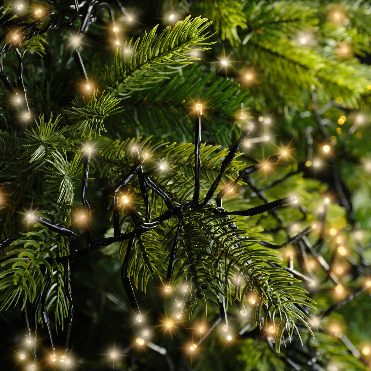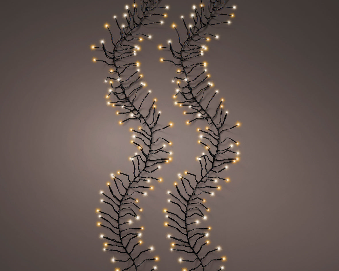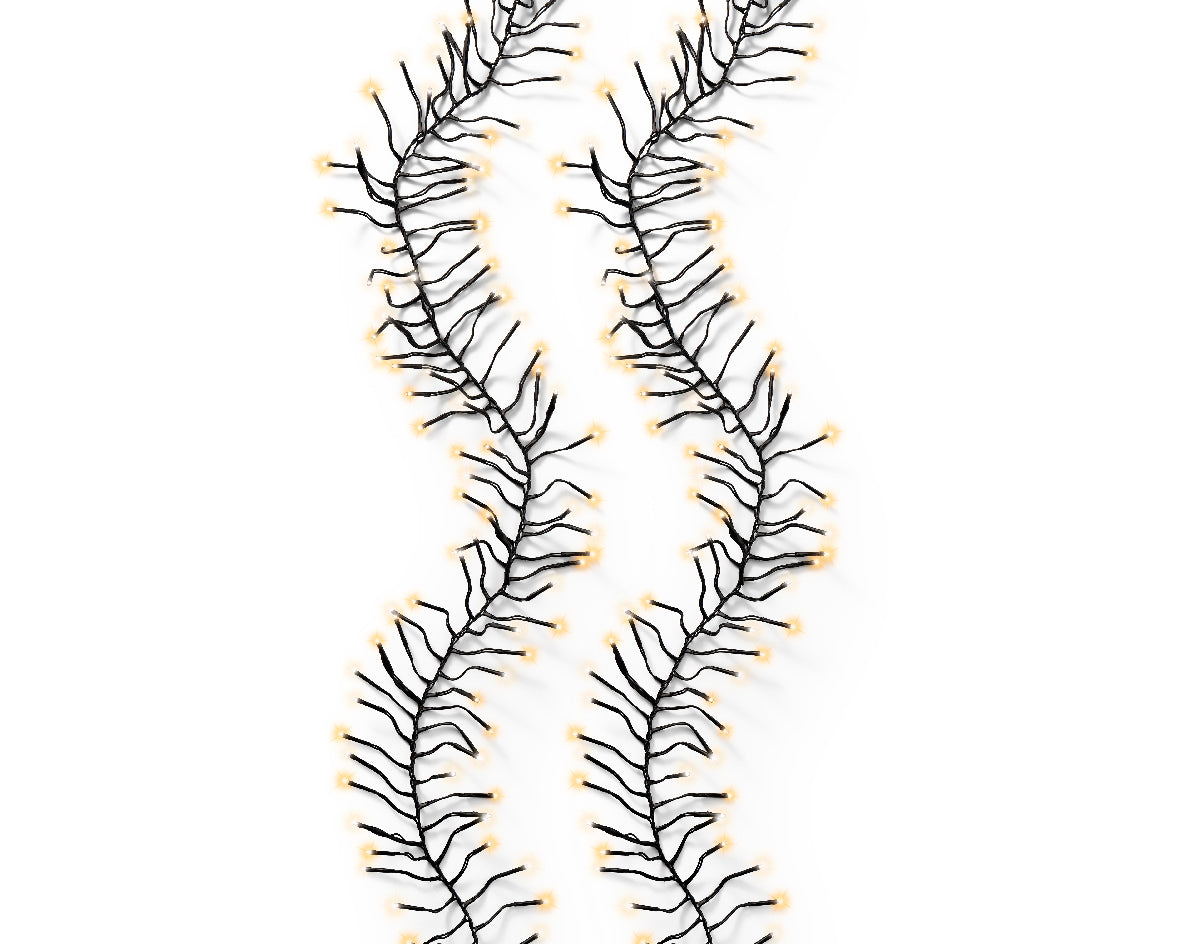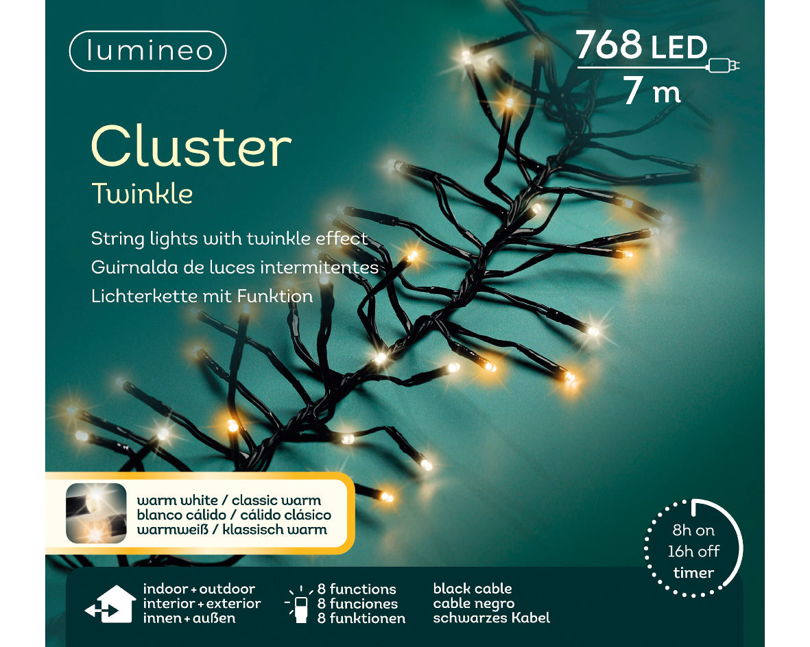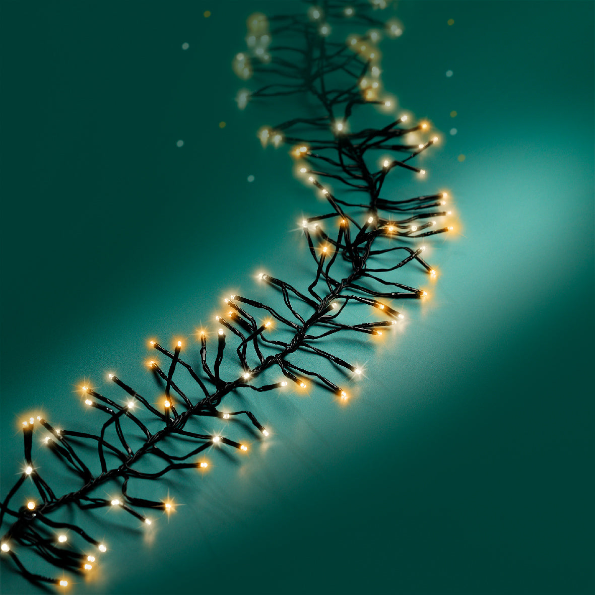 Wyjątkowo gęste lampki typu cluster o długości 7 metrów i aż 768 diodach LED. Dzięki bardzo małemu odstępowi między diodami (0,9 cm), tworzą intensywny i gęsty efekt świetlny – idealny do dekoracji świątecznych drzewek, balustrad lub elementów architektury ogrodowej. Lampki w dwóch kolorach (klasyczny ciepły i klasyczna biel)