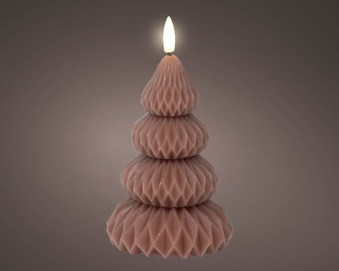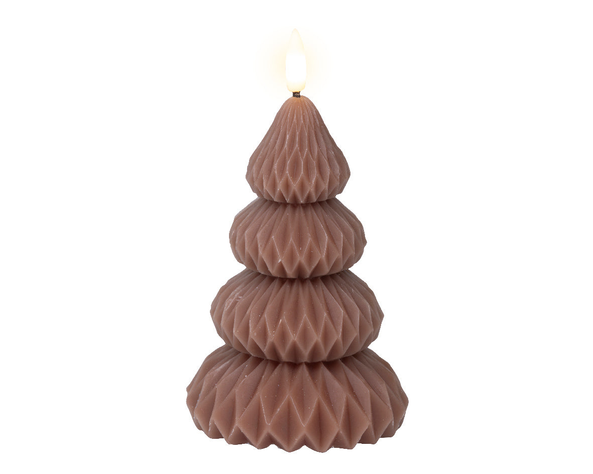 Dekoracyjna świeca LED wykonana z prawdziwego wosku w głębokim brązowym kolorze. Stylowe, gładkie wykończenie i klasyczny kształt choinki czynią ją idealną ozdobą na okres świąteczny. Emituje ciepłe, delikatne światło z realistycznym efektem płomienia typu wick flame.