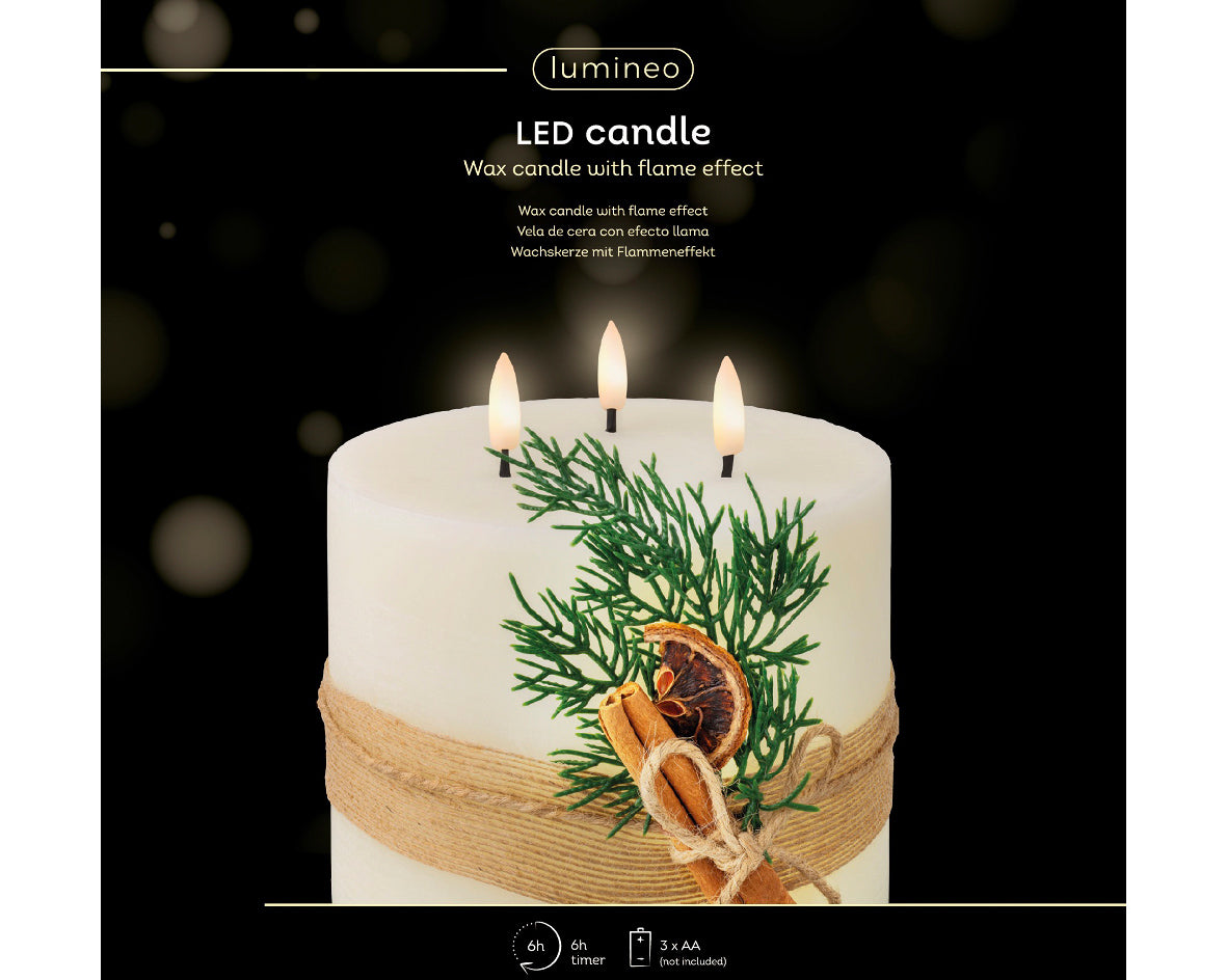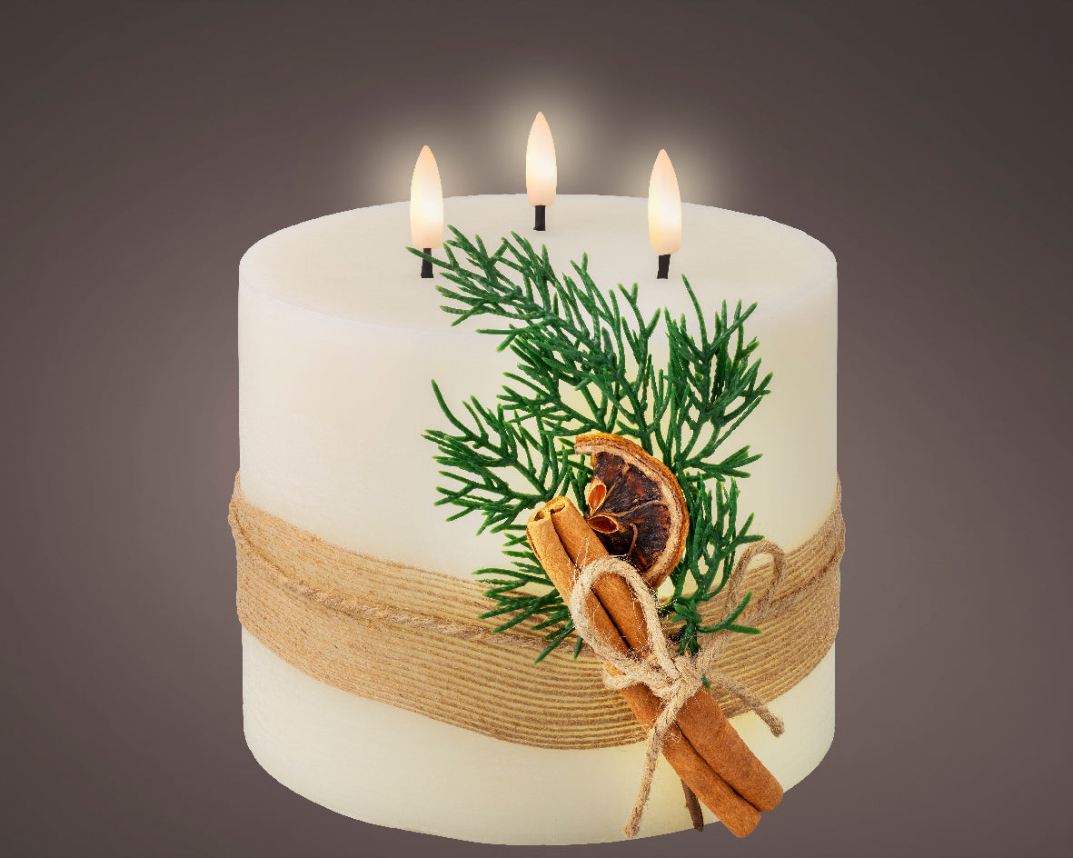Dekoracyjna świeca LED z naturalnym wykończeniem rustykalnym i efektowną aplikacją liści. Wykonana z prawdziwego wosku w eleganckim kremowym kolorze, oferuje realistyczny efekt płomienia typu wick flame i ciepłe, przyjemne światło.
