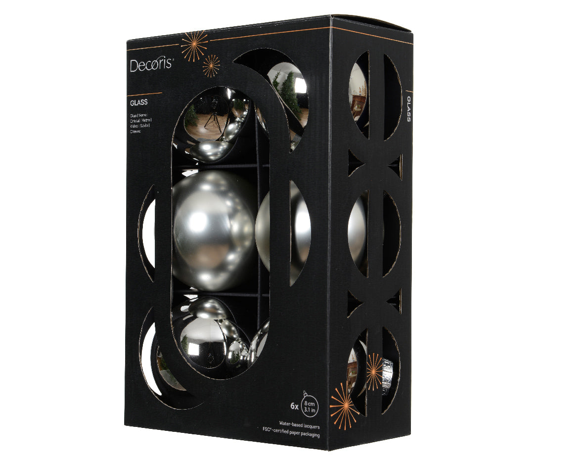 Klasyczne srebrne bombki w eleganckim miksie matu i połysku – idealne na każdą choinkę. Wykonane ze szkła, zapakowane bez plastiku w ekologiczne pudełko z czarnym papierowym wkładem.
