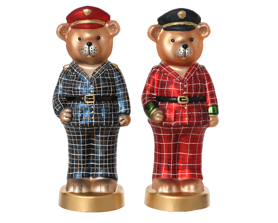Elegancka figurka misia wykonana ze szkła, ubrana w świąteczny strój z czapką – dostępna w dwóch wersjach kolorystycznych: czerwonej i niebieskiej (możliwość wyboru). Wysoka na niemal 30 cm dekoracja przyciąga uwagę lekkością formy i subtelnym połyskiem. Idealna do bożonarodzeniowych aranżacji wnętrz, na kominek, stół lub witrynę sklepową. To delikatny i wyjątkowy akcent, który podkreśli świąteczny klimat każdego pomieszczenia.