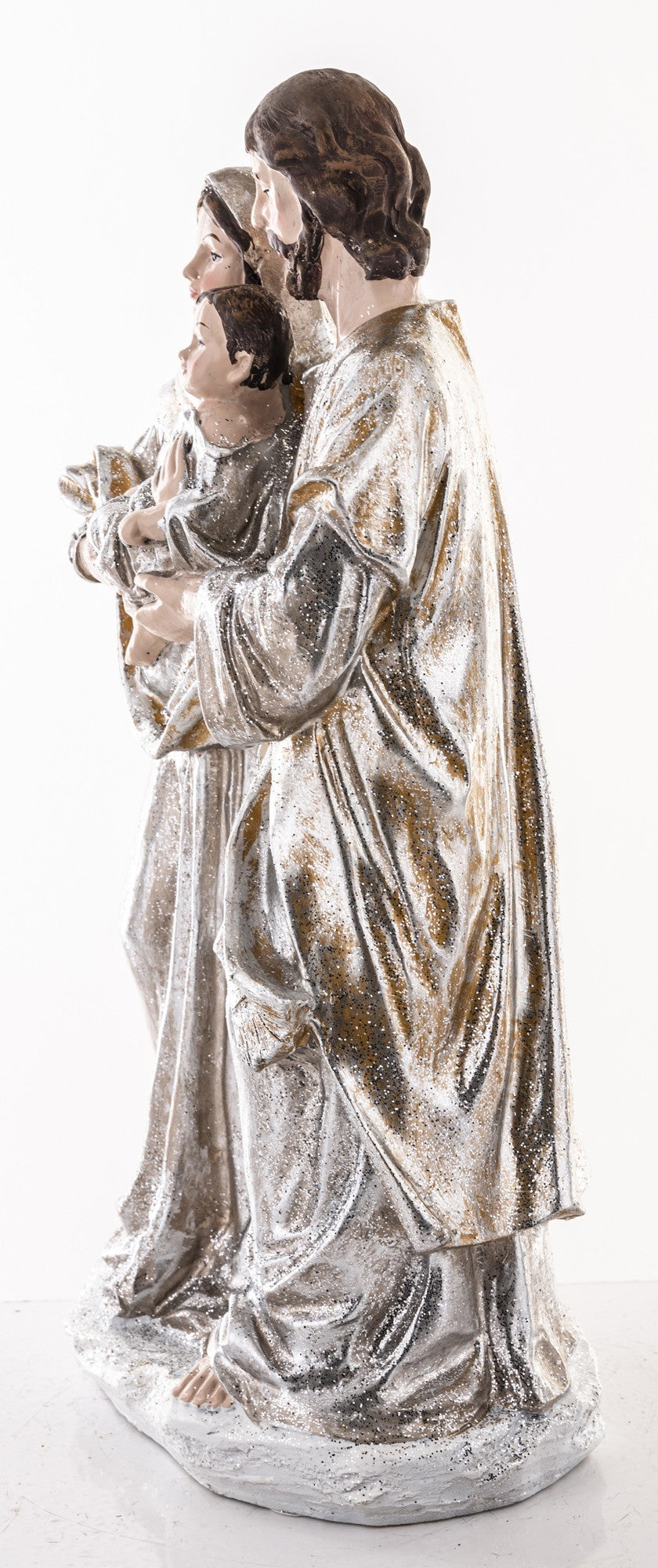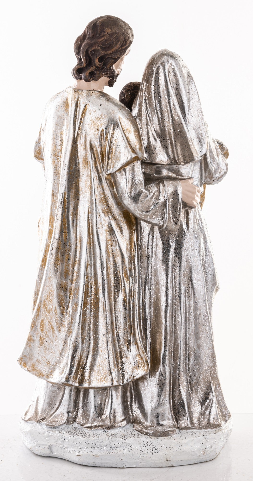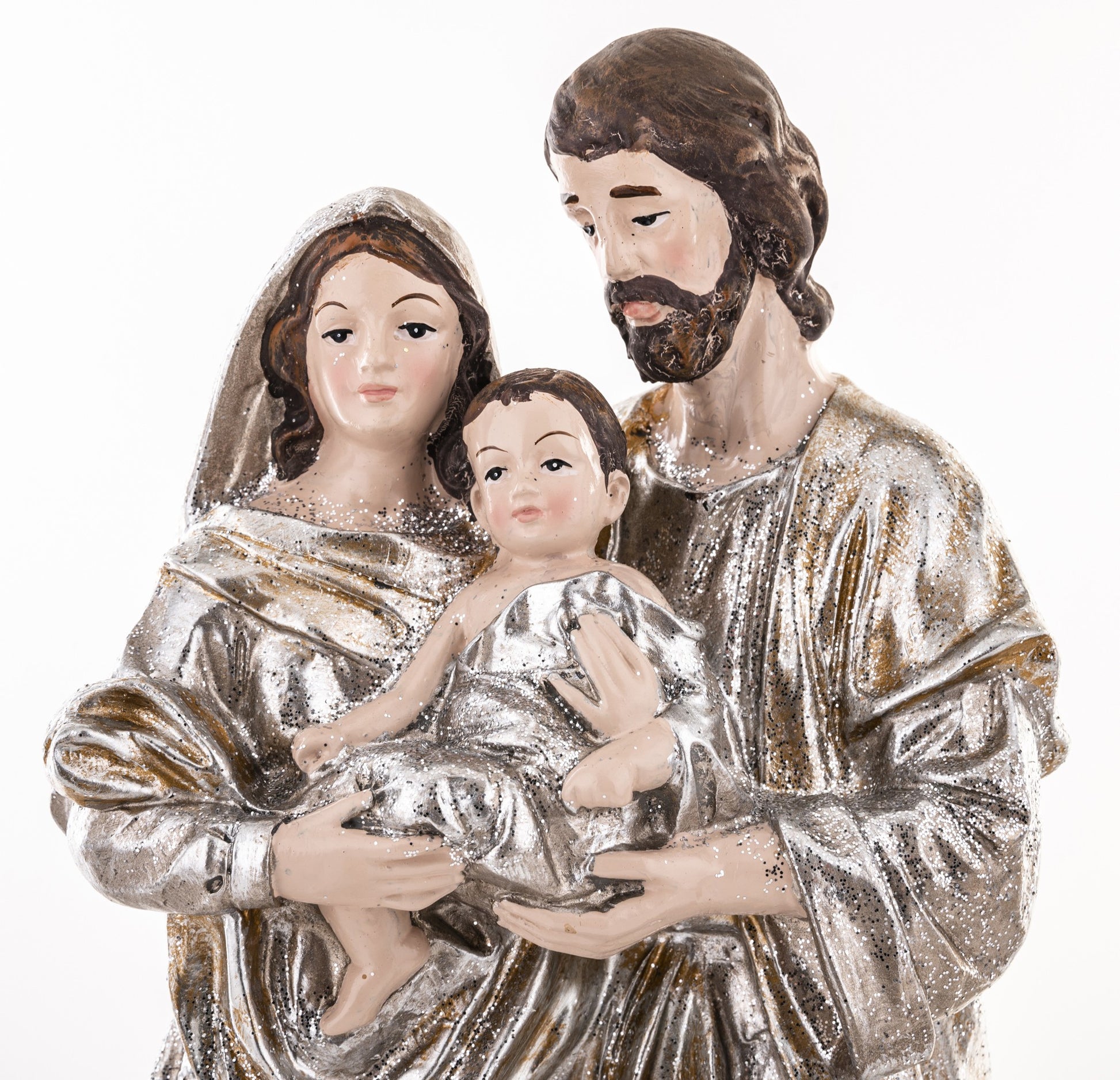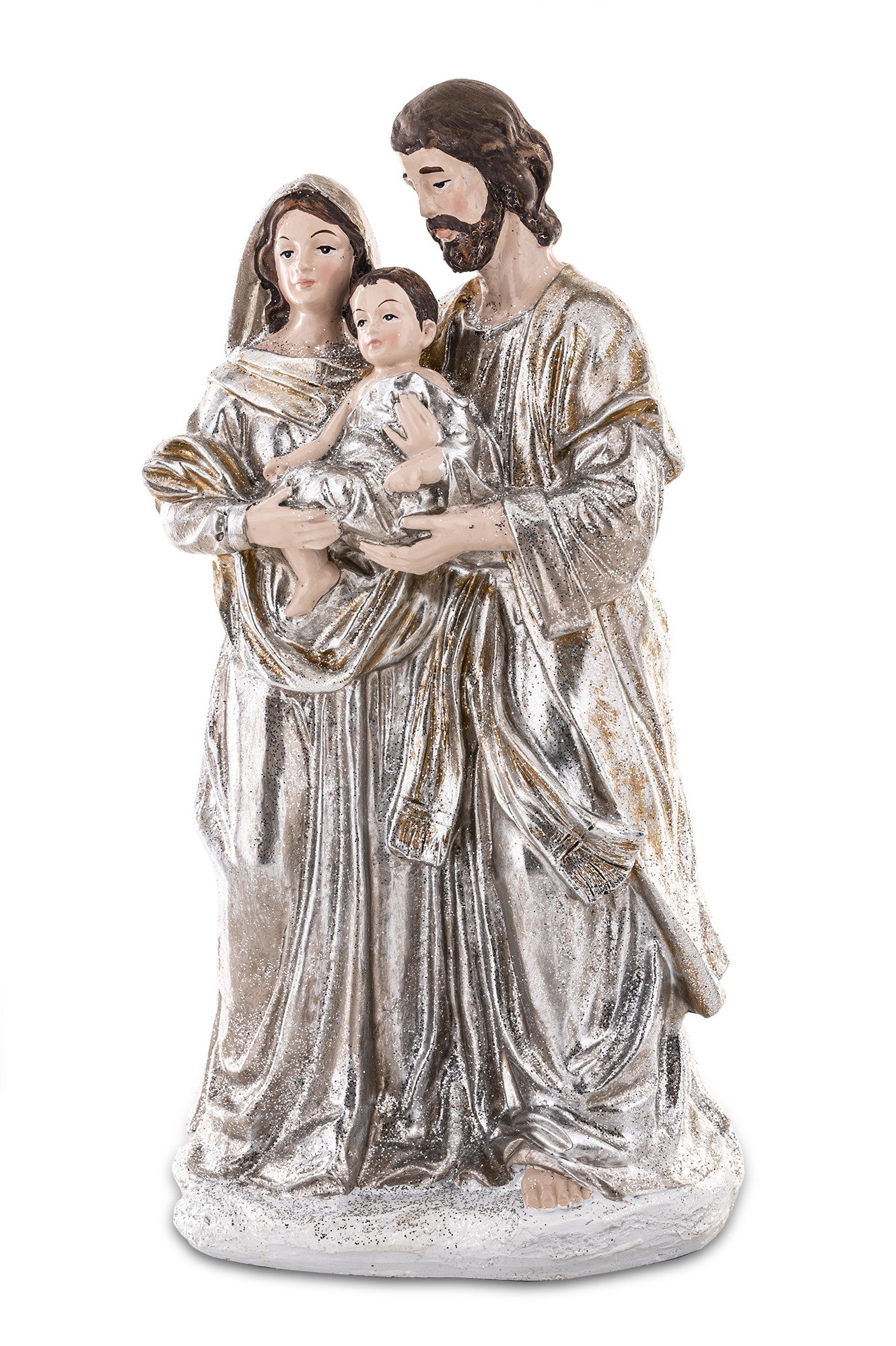 Elegancka figurka Świętej Rodziny w odcieniach srebra i złamanej bieli to wyjątkowa dekoracja, która wprowadzi do wnętrza blask i świąteczny spokój. Przedstawia Maryję, Józefa i Dzieciątko Jezus w delikatnym, pełnym ciepła ujęciu, symbolizującym miłość i harmonię rodzinnych Świąt Bożego Narodzenia.
