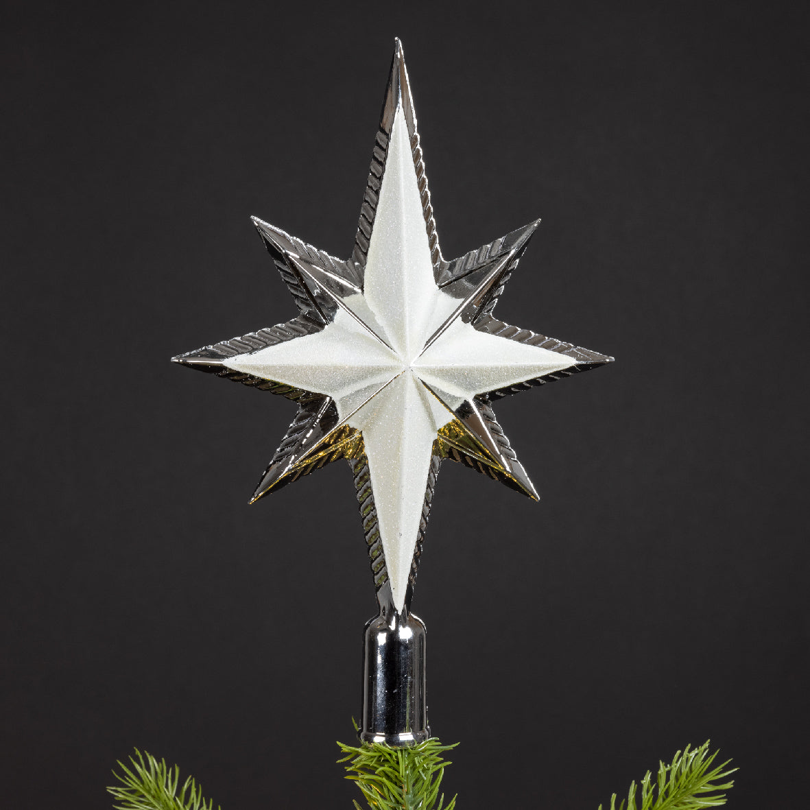 Lekki i efektowny szpic w kształcie klasycznej gwiazdy, wykonany z nietłukącego polistyrenu. Pokryty intensywnie srebrnym brokatem – pięknie odbija światło i doskonale prezentuje się na czubku choinki.
