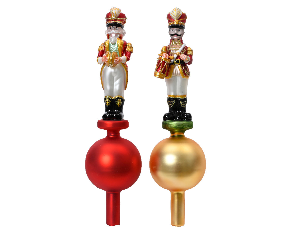 Ręcznie dmuchany i zdobiony szpic w kształcie klasycznego dziadka do orzechów – bębenkowego żołnierzyka. Dostępny w dwóch różnych wersjach kolorystycznych, pełnych świątecznego uroku. Idealny jako efektowne wykończenie choinki w tradycyjnym lub bajkowym stylu.
