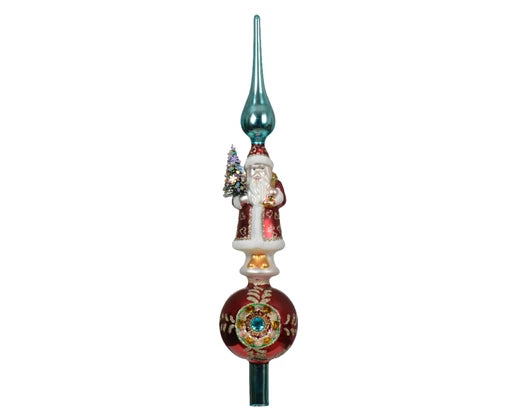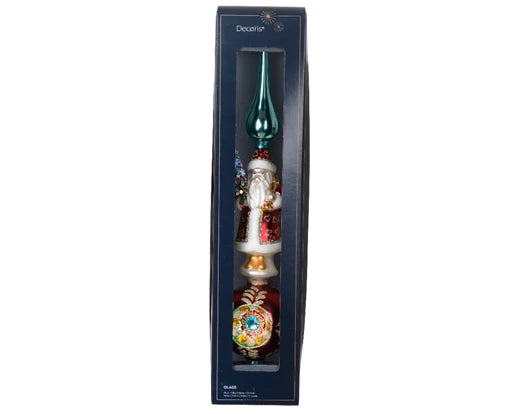 Ręcznie dmuchany szpic choinkowy w kształcie klasycznego Mikołaja. Smukły, efektowny i utrzymany w czerwonej kolorystyce z wielobarwnymi detalami. Idealny do tradycyjnych i bajkowych aranżacji świątecznych – przyciąga wzrok i pięknie wieńczy każdą choinkę.