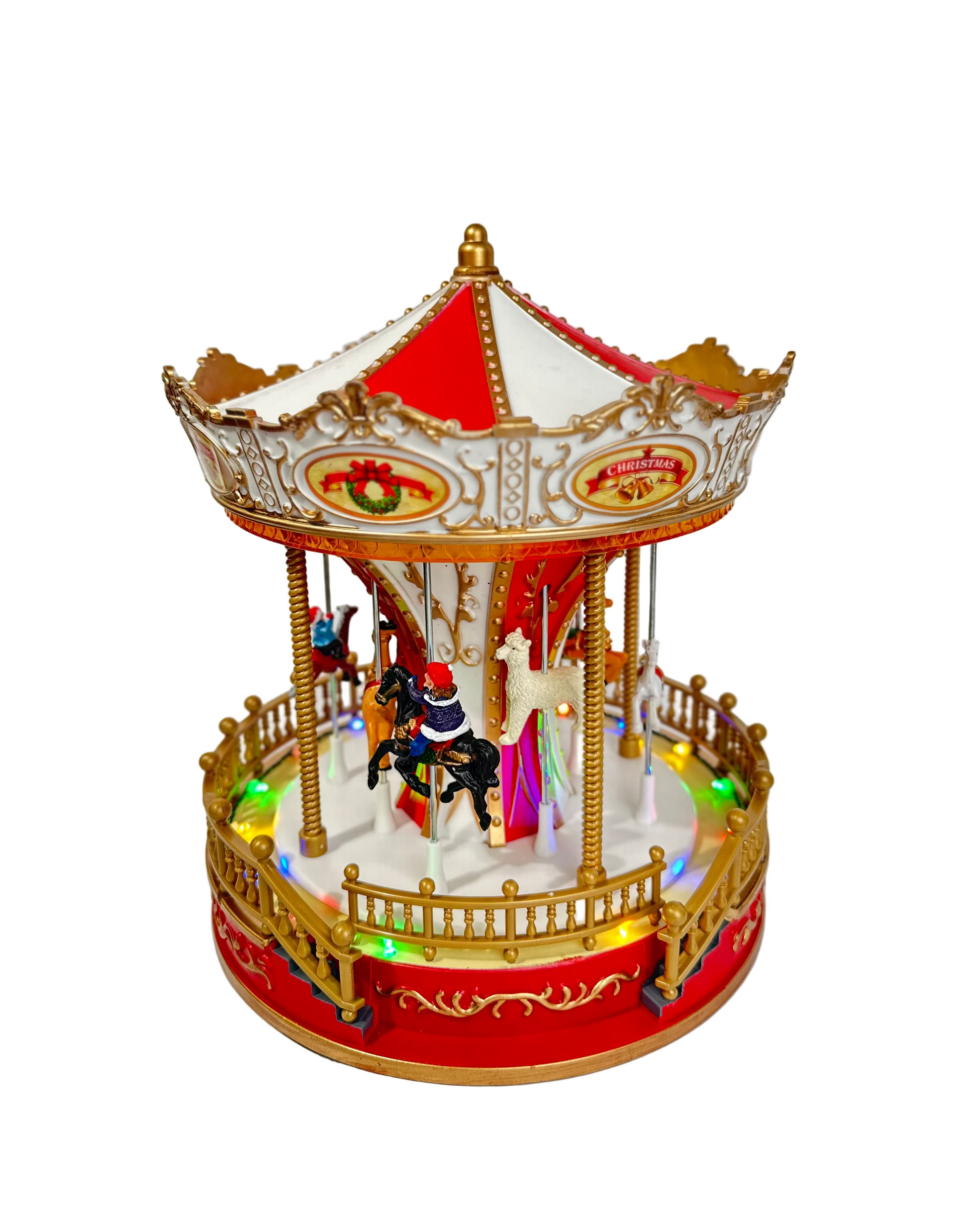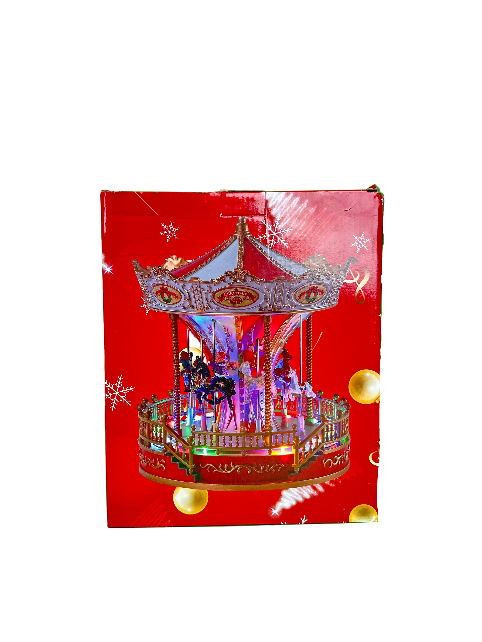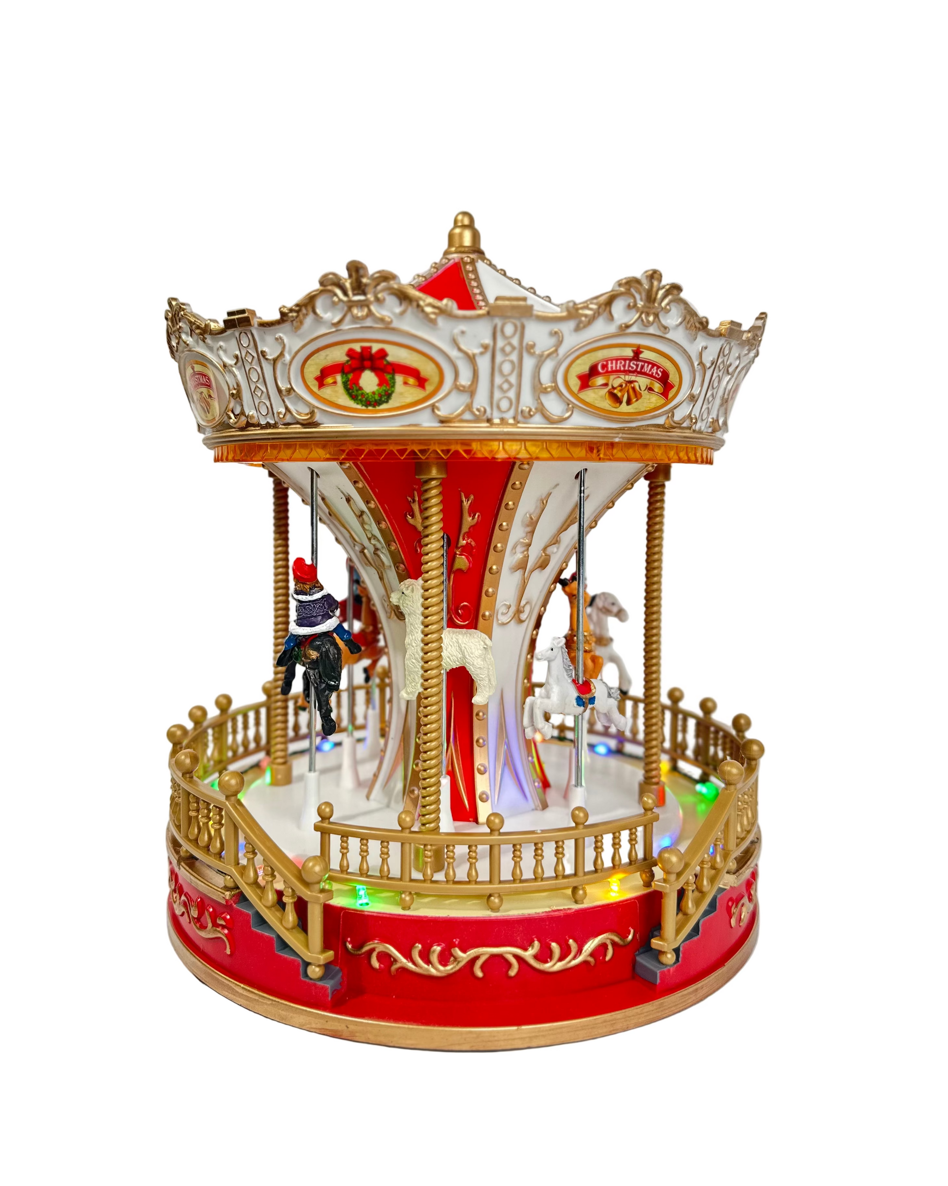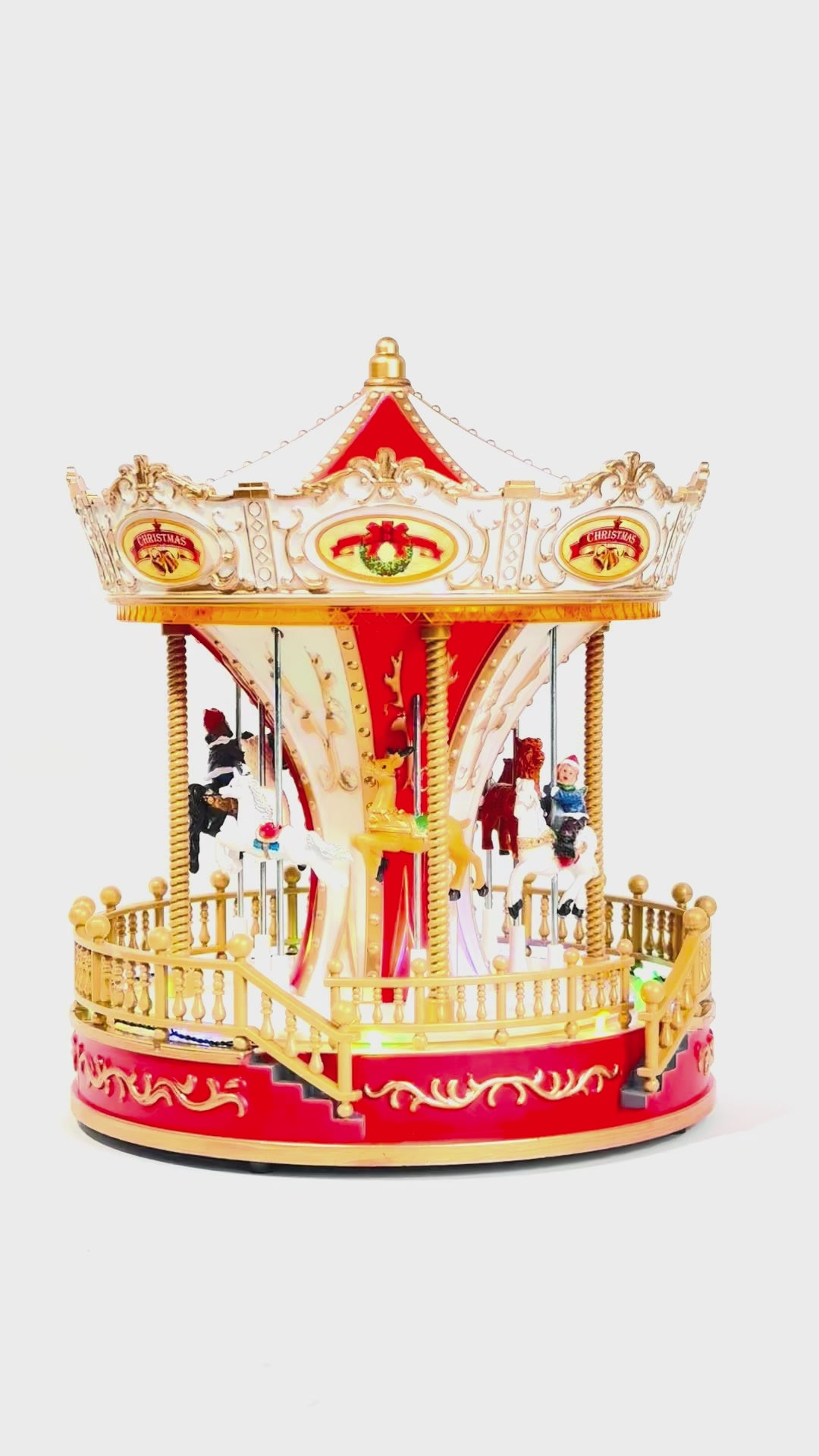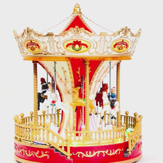 Karuzela wykonana z dbałością o każdy detal, utrzymana w eleganckiej kolorystyce czerwieni, złota i bieli, zachwyca bogactwem zdobień i realistycznymi figurkami koników. Obracająca się platforma, efekty świetlne LED oraz nastrojowa melodia tworzą efektowną, dynamiczną scenę przypominającą świąteczne jarmarki i zimowe wspomnienia z dzieciństwa.