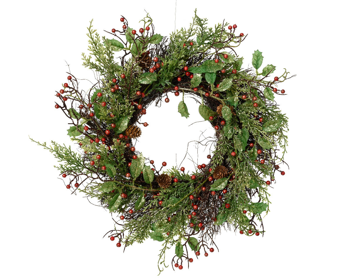 Dekoracyjny wieniec o średnicy 40 cm, to idealny wybór do wnętrz w świątecznym stylu. Zdobiony czerwonymi jagodami, szyszkami i delikatnym brokatem, który subtelnie odbija światło. Wykonany z dbałością o detale – z naturalną bazą z wierzby i jutowym sznurkiem.