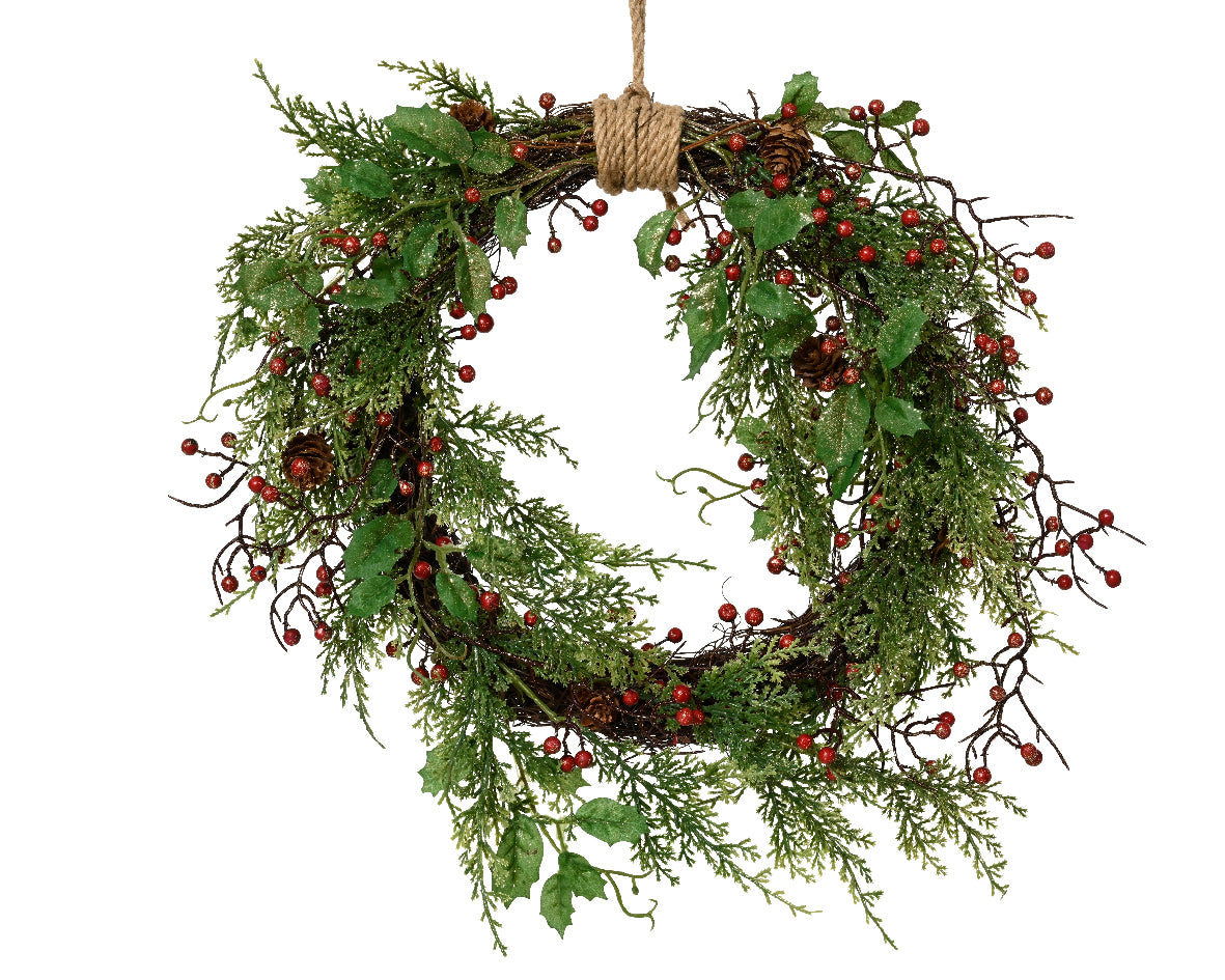Efektowny wieniec przeznaczony do dekoracji wnętrz. Zdobiony czerwonymi jagodami, szyszkami i brokatowym wykończeniem, które nadaje całości eleganckiego, świątecznego blasku. Naturalne detale, takie jak podstawa z wierzby i jutowy sznurek, podkreślają klasyczny charakter tej kompozycji.