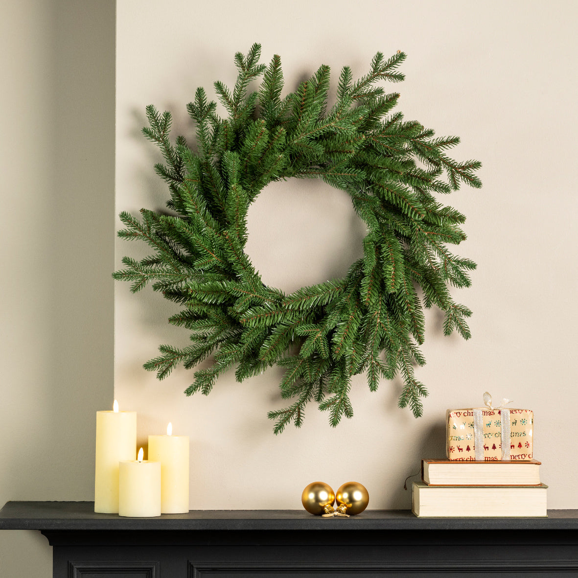 Naturalnie wyglądający wieniec świąteczny, gęsto uformowany z realistycznych gałązek typu PVC oraz PE, które wiernie odwzorowują prawdziwe igliwie. Klasyczna, zielona ozdoba do wnętrz – idealna na drzwi, ścianę lub jako baza do dalszego dekorowania.