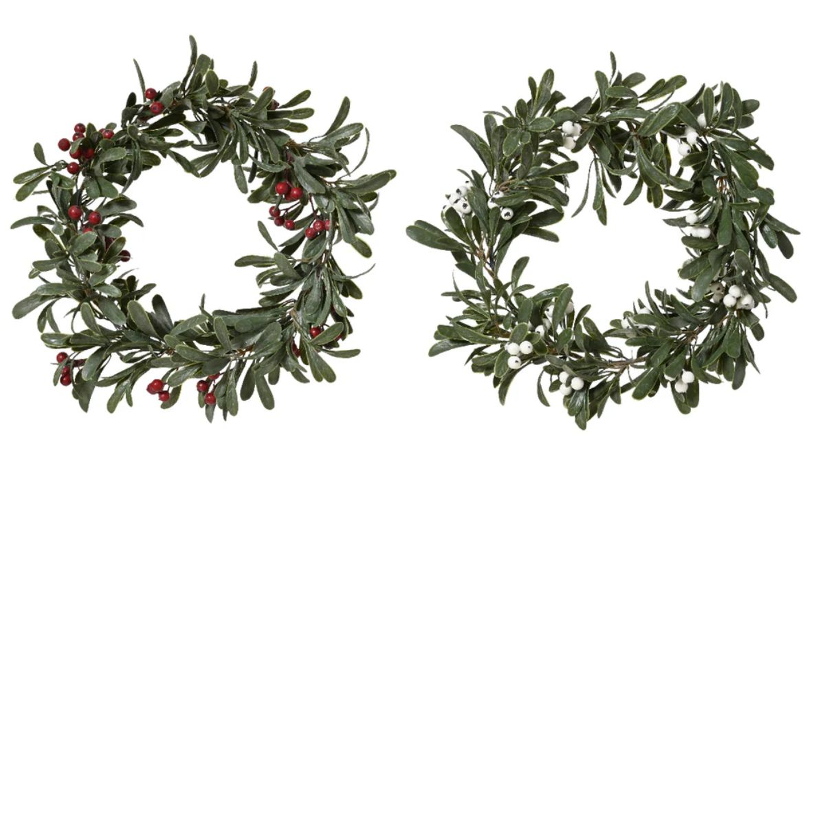 Dekoracyjny wieniec świąteczny o średnicy 35 cm, wykończony efektem szronu i ozdobiony drobnymi jagodami. Dostępny w dwóch wersjach kolorystycznych: biały lub czerwony (jemioła). Dzięki kompaktowemu rozmiarowi doskonale sprawdzi się jako ozdoba drzwi, ściany, kominka lub stołu. Idealny zarówno do wnętrz domowych, jak i do przestrzeni komercyjnych.