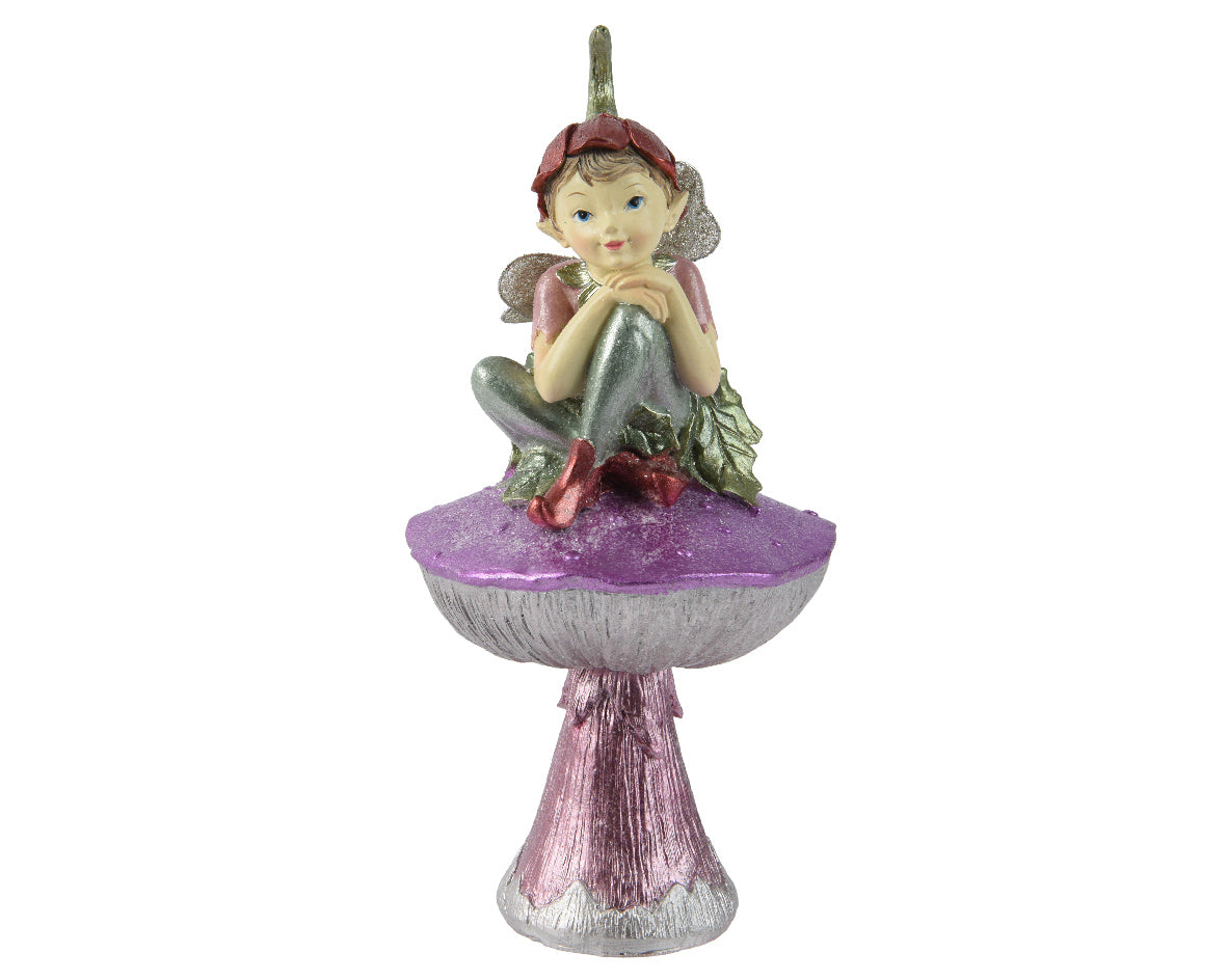 Delikatna, ręcznie wykonana figurka wróżki siedzącej na grzybku. Wykonana z żywicy syntetycznej (polyresin), urzeka kolorowym wykończeniem i magicznym klimatem. To doskonała dekoracja do dziecięcego pokoju, wiosennych aranżacji wnętrz lub jako uroczy akcent w domowej kolekcji dekoracji inspirowanych naturą.