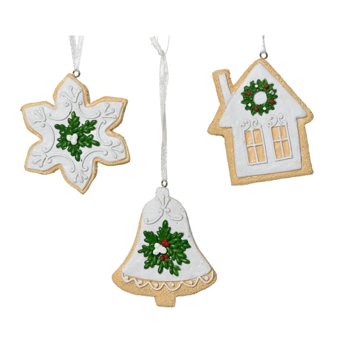 Ręcznie zdobiona dekoracja wykonana z polirezyny, dostępna w trzech uroczystych kształtach: domek, dzwonek lub śnieżynka. Idealna jako ozdoba choinkowa lub do tworzenia zimowych kompozycji dekoracyjnych.