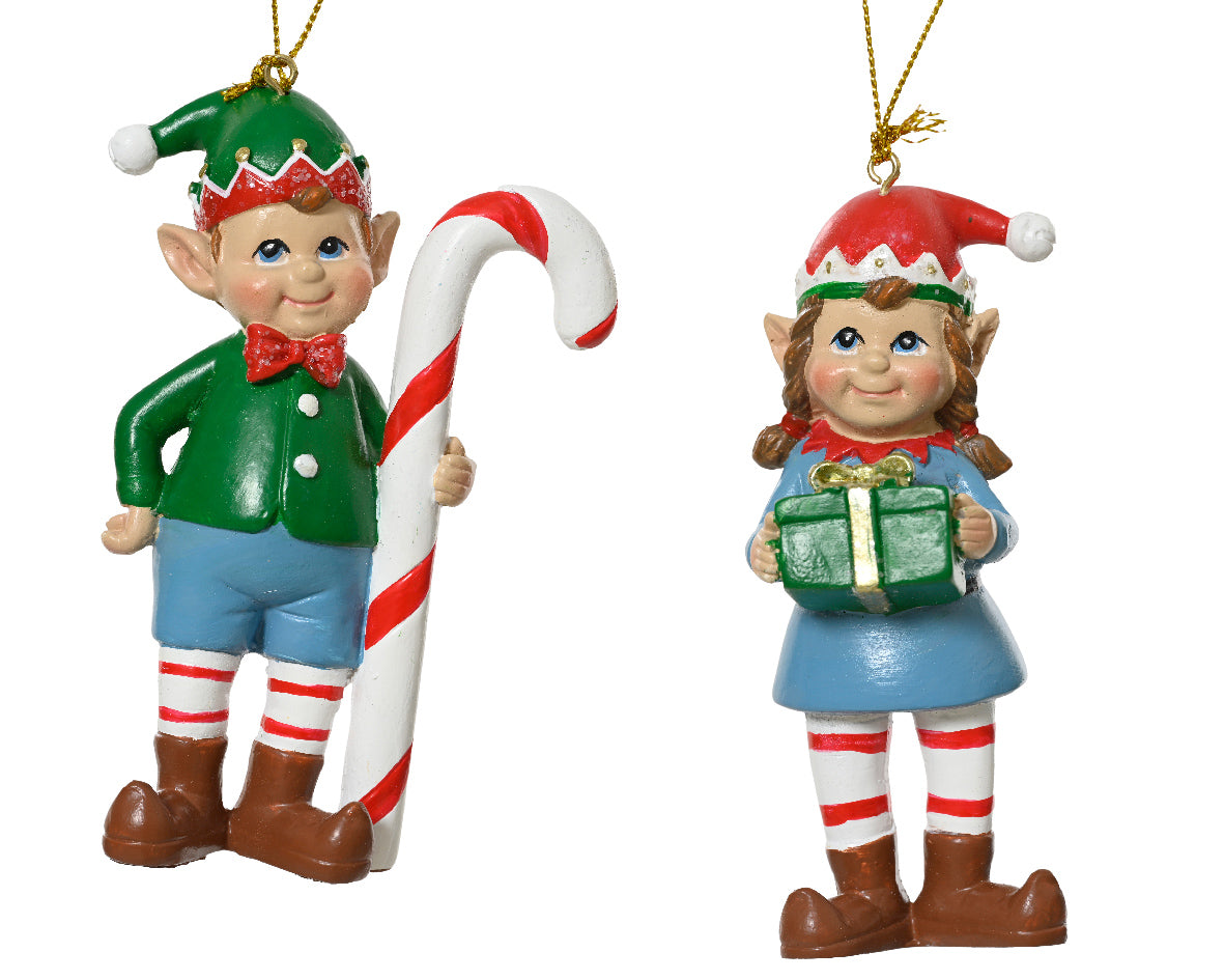 Uroczy elf świąteczny wykonany z polirezyny, dostępny w dwóch wersjach: z prezentem lub z cukrową laską. Detale w odcieniach czerwieni i zieleni, idealne do świątecznych dekoracji choinkowych i nie tylko.