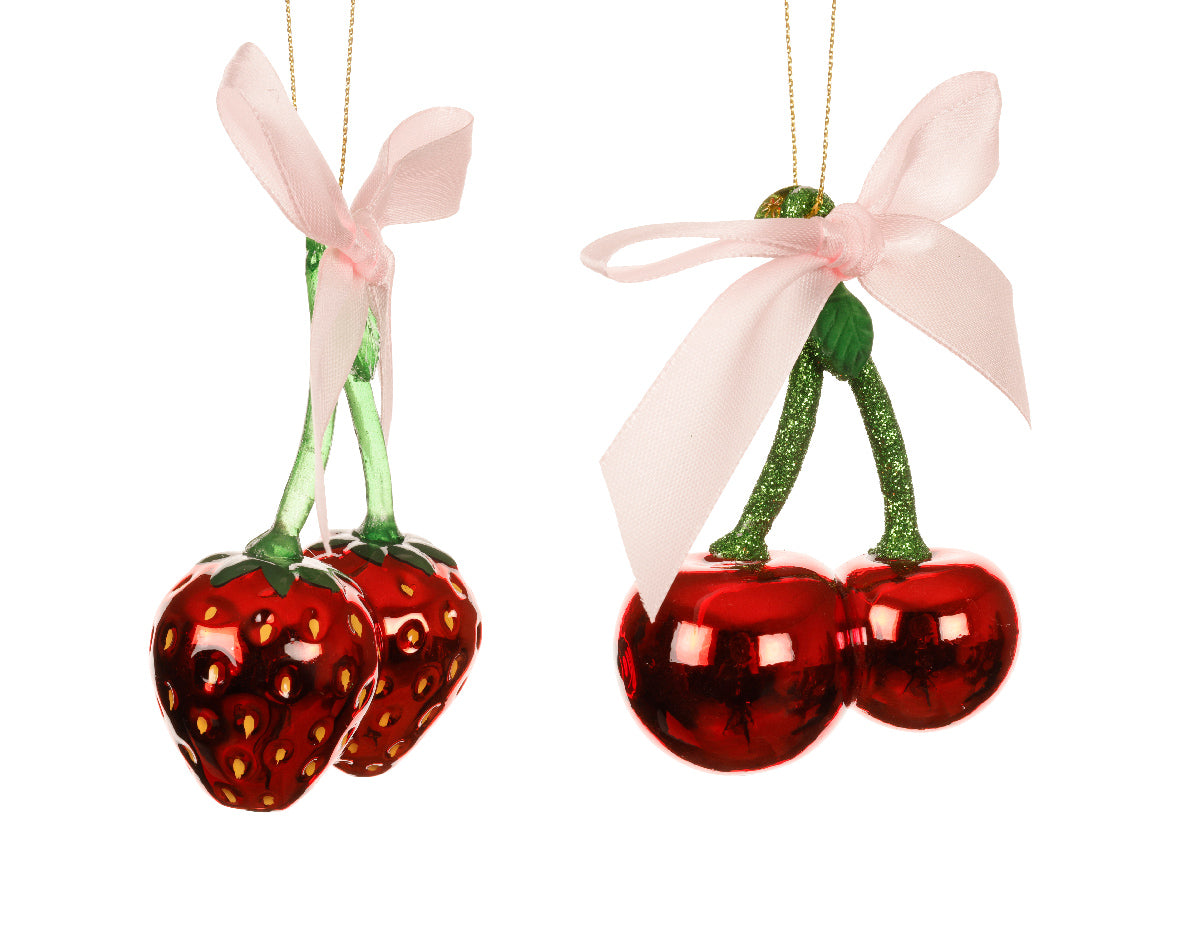Ręcznie zdobiona bombka w formie owocu – do wyboru czereśnia lub truskawka, każda ozdobiona uroczą kokardką. Wykończenie połysk–mat, pełne świątecznego uroku i oryginalnego charakteru. Idealna na choinkę lub jako wyjątkowy akcent w sezonowych dekoracjach.