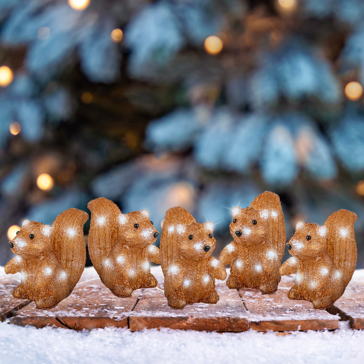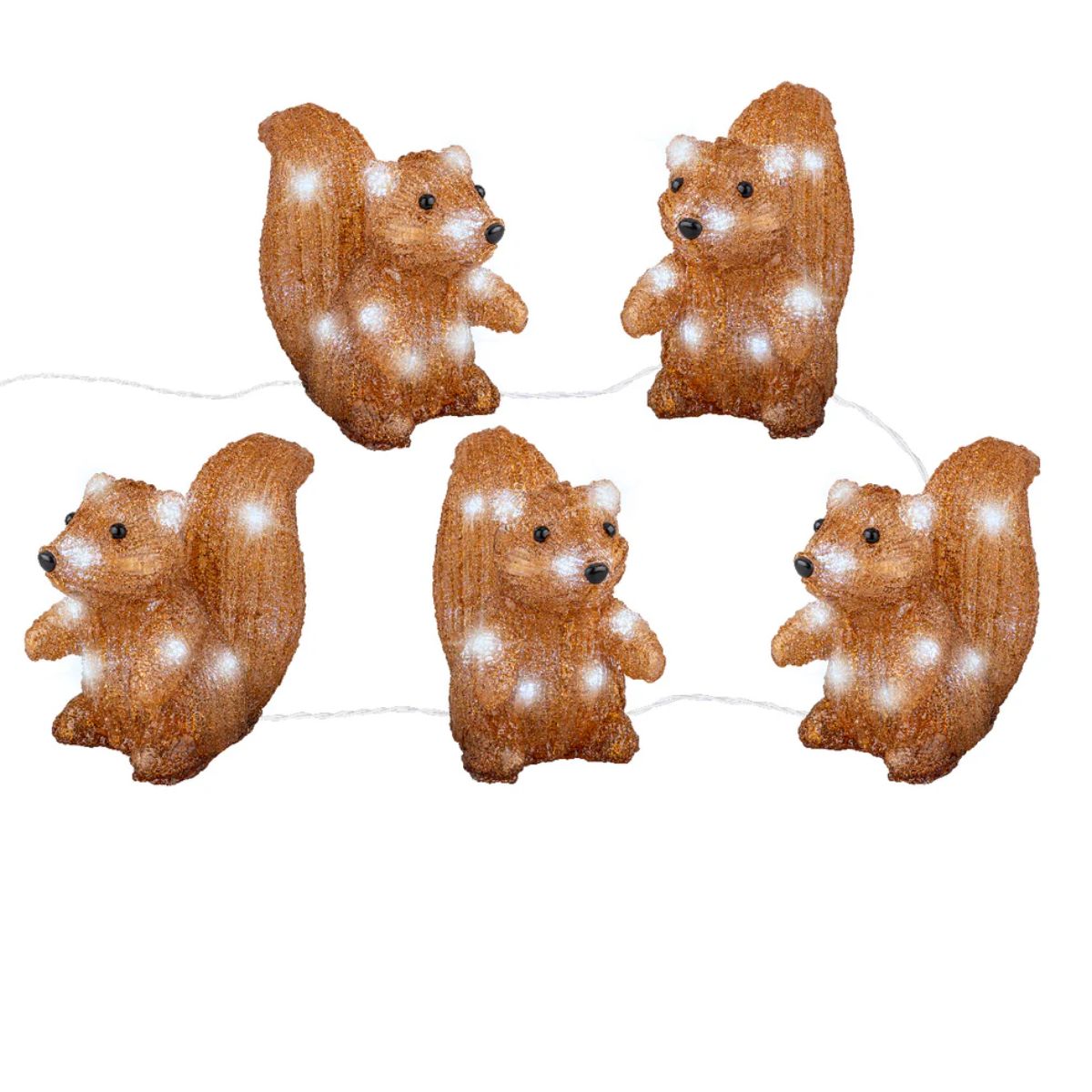 Zestaw 5 brązowych wiewiórek akrylowych z chłodnym białym światłem LED, idealny na zewnątrz. Zasilany bateryjnie (3×AA, brak w zestawie), z timerem 6 h i czasem pracy do 45 godzin. Przezroczysty kabel, długość zestawu 200 cm, 70 diod LED.